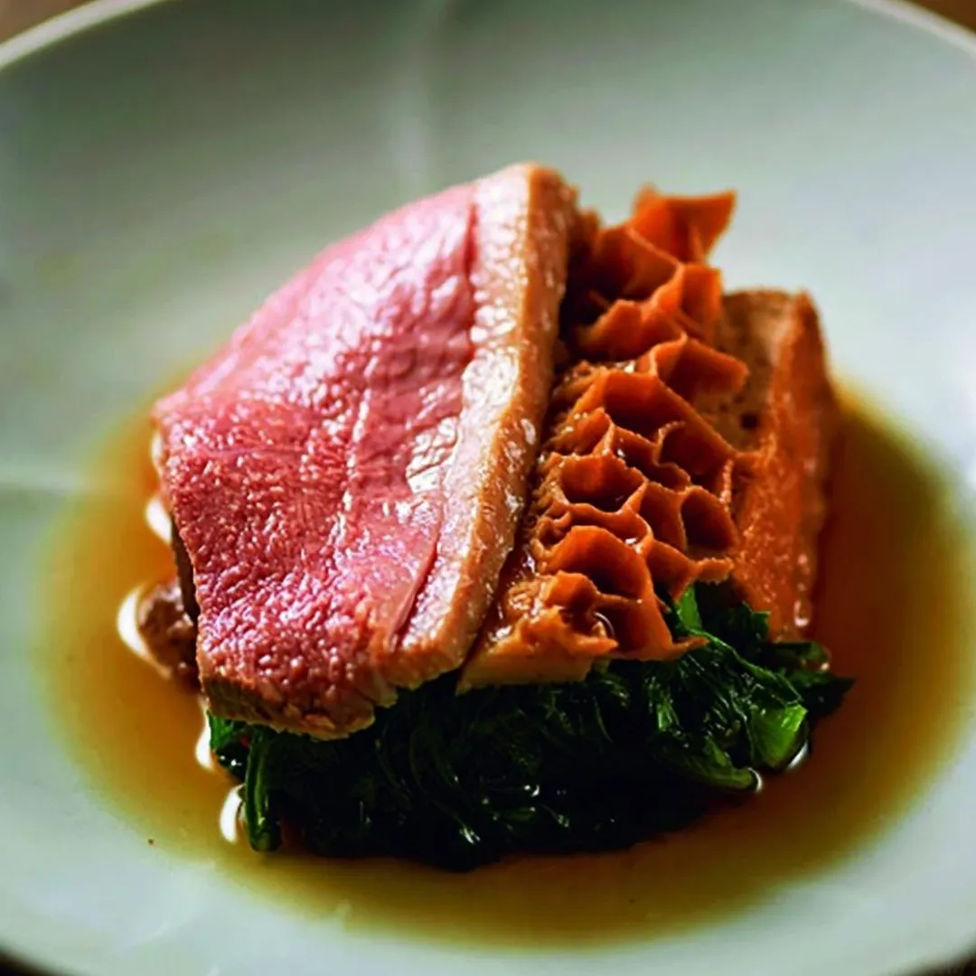 「鴨とハチノスの鹵水煮」。内臓類は煮込み、鴨肉は低温調理でと、細やかに加熱方法を変えてレストランならではの洗練されたスタイルに