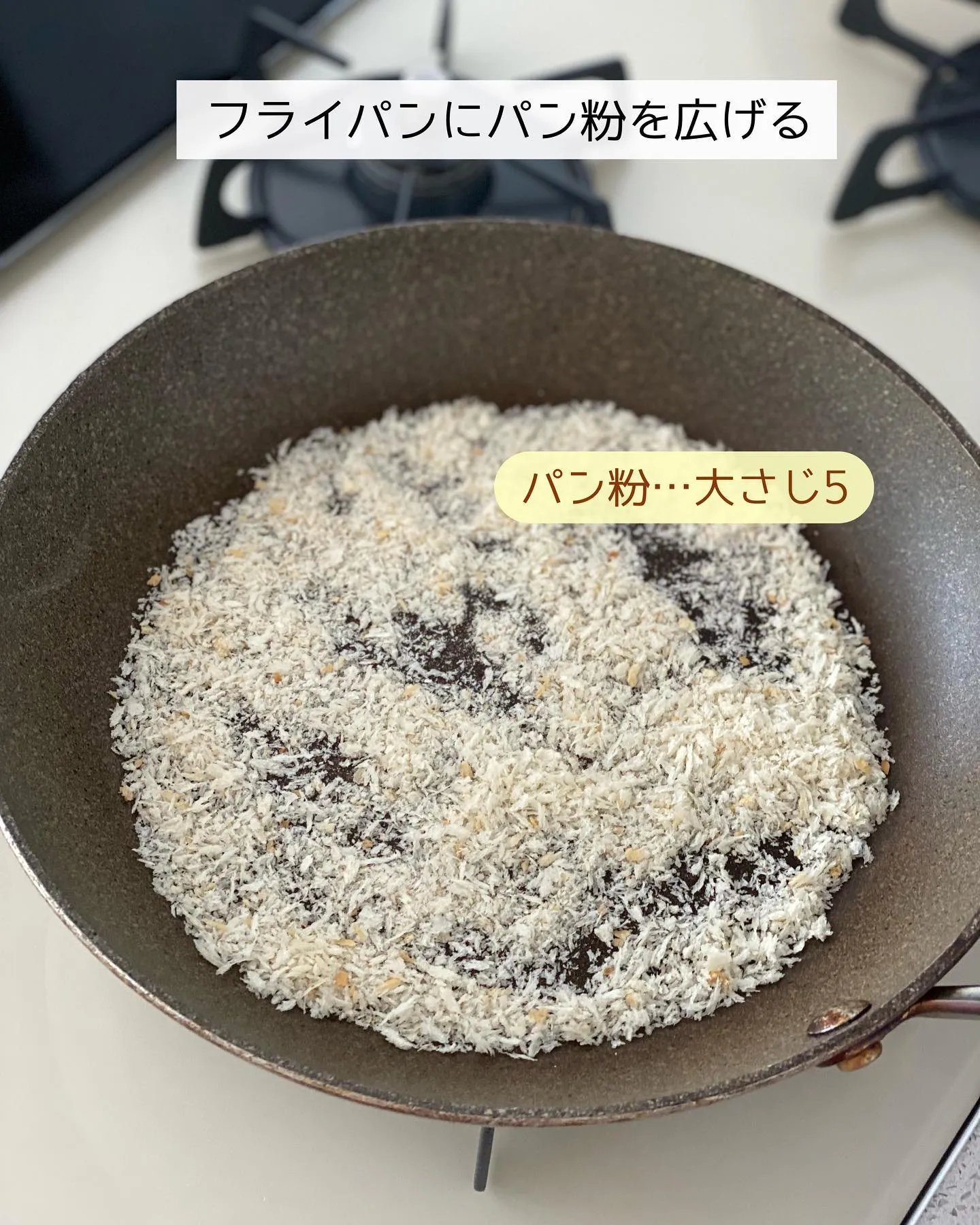 ➌フライパンにパン粉を広げ、2を手のひらサイズに広げて𝟸枚乗せる。