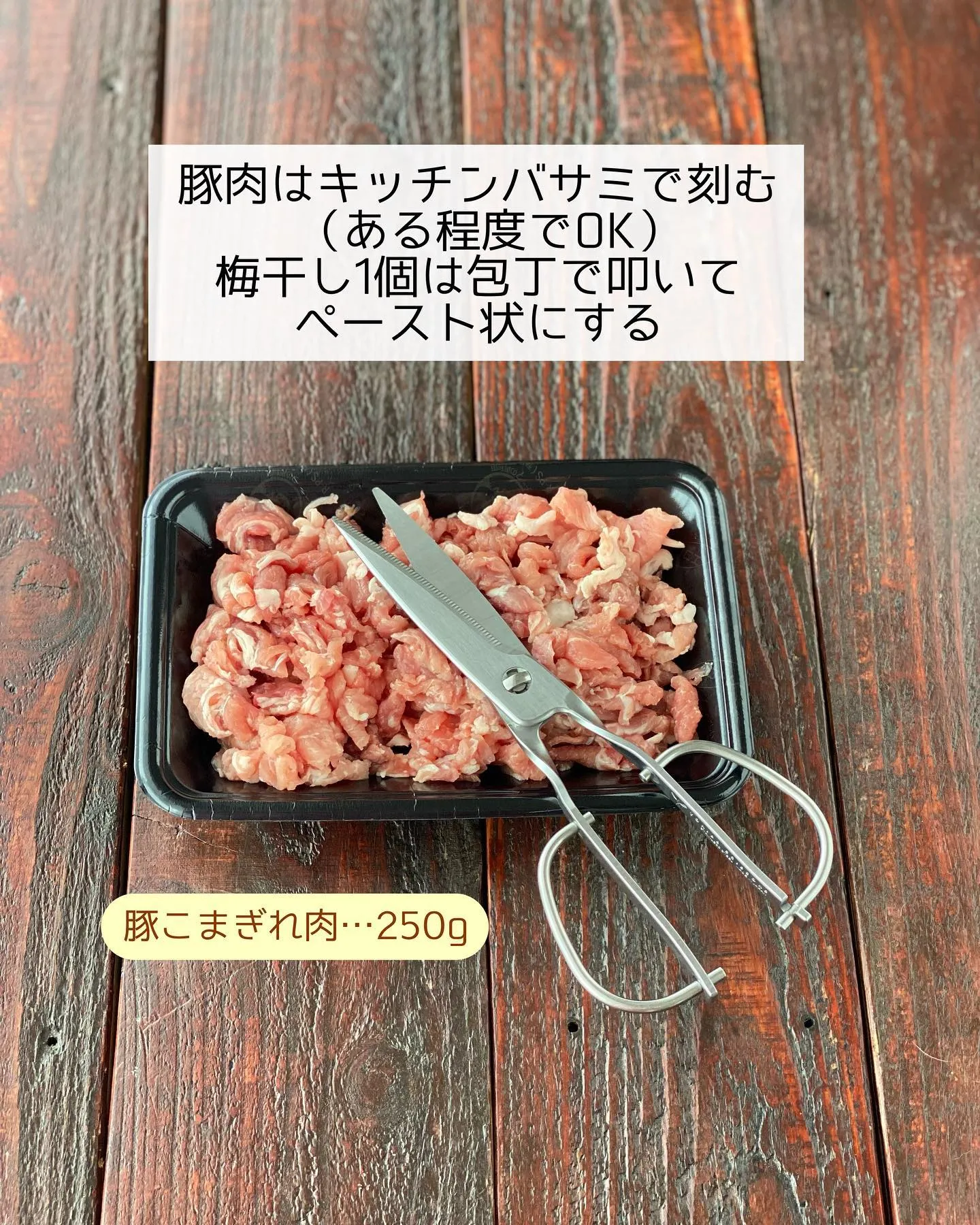 ➊豚肉はキッチンバサミで刻む(ある程度で𝙾𝙺)。梅干しは包丁で叩いてペースト状にする。