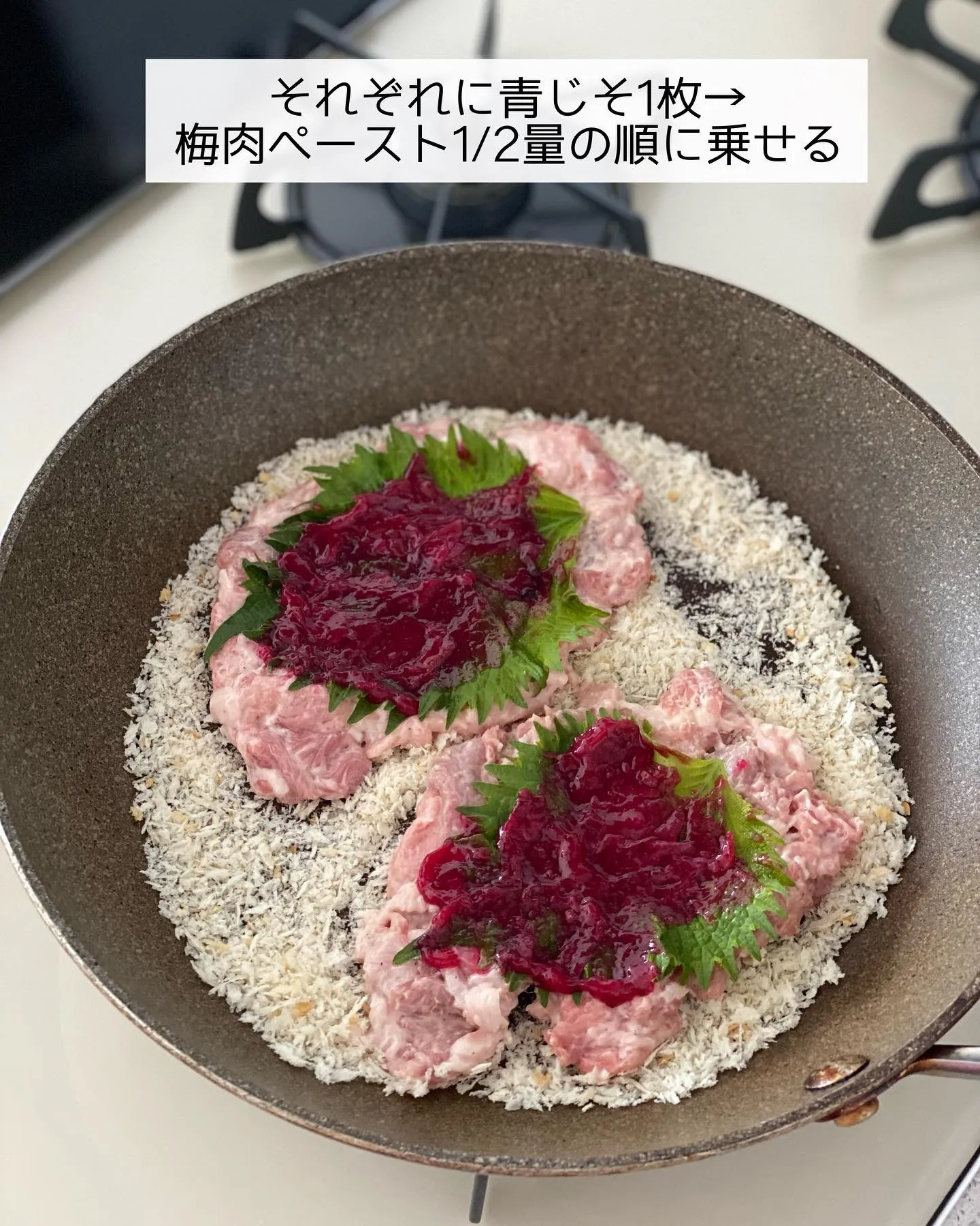 ➍それぞれに、青じそ𝟷枚→梅肉ペースト𝟷/𝟸量の順に乗せ、残りの豚肉を重ねる。全体にパン粉をまぶし、サラダ油を加える。