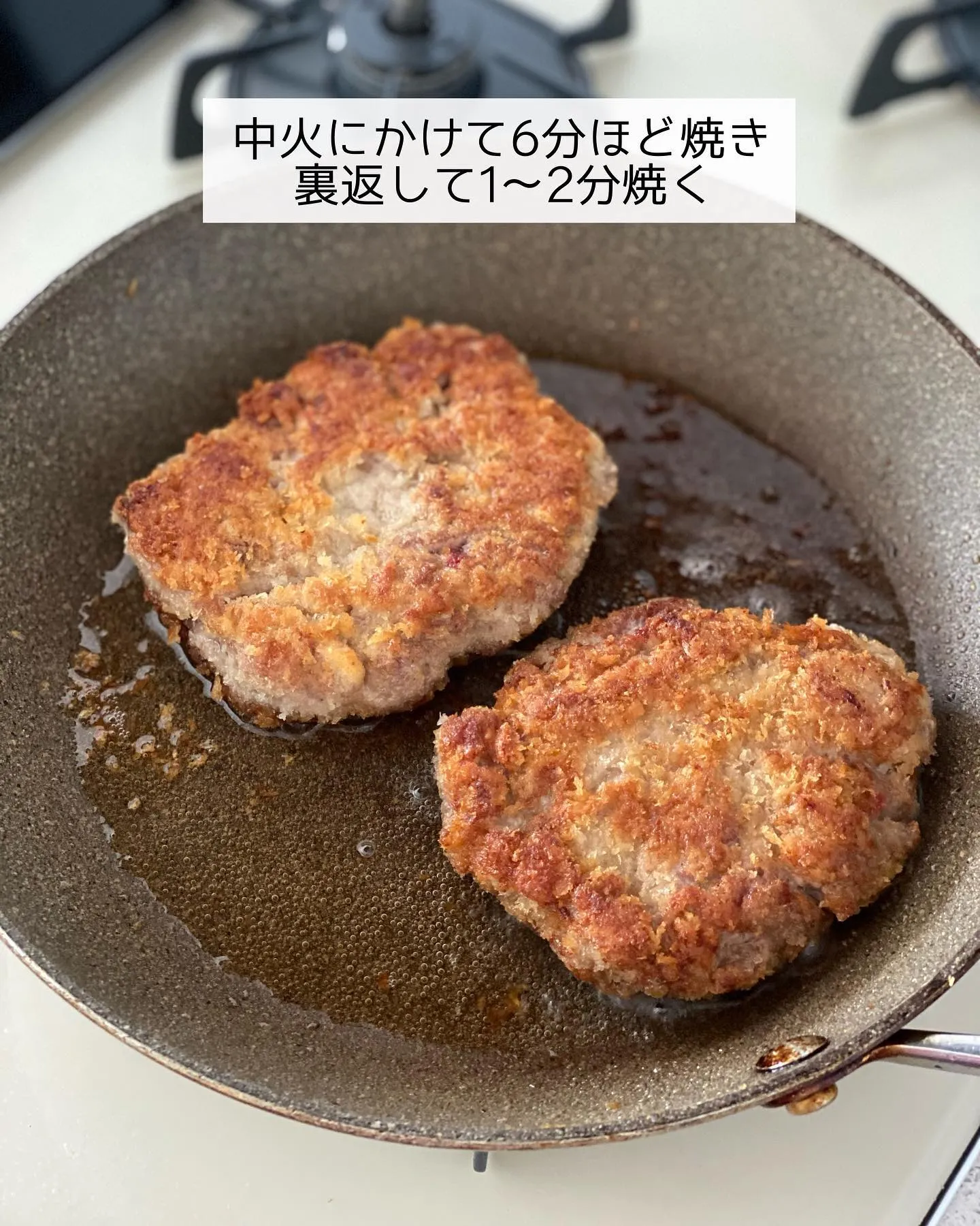 ➎中火にかけ、𝟼分ほど焼いたら裏返し、もう片面も𝟷〜𝟸分焼く。取り出して油を切り、お好みの大きさに切ってお召し上がりください♩