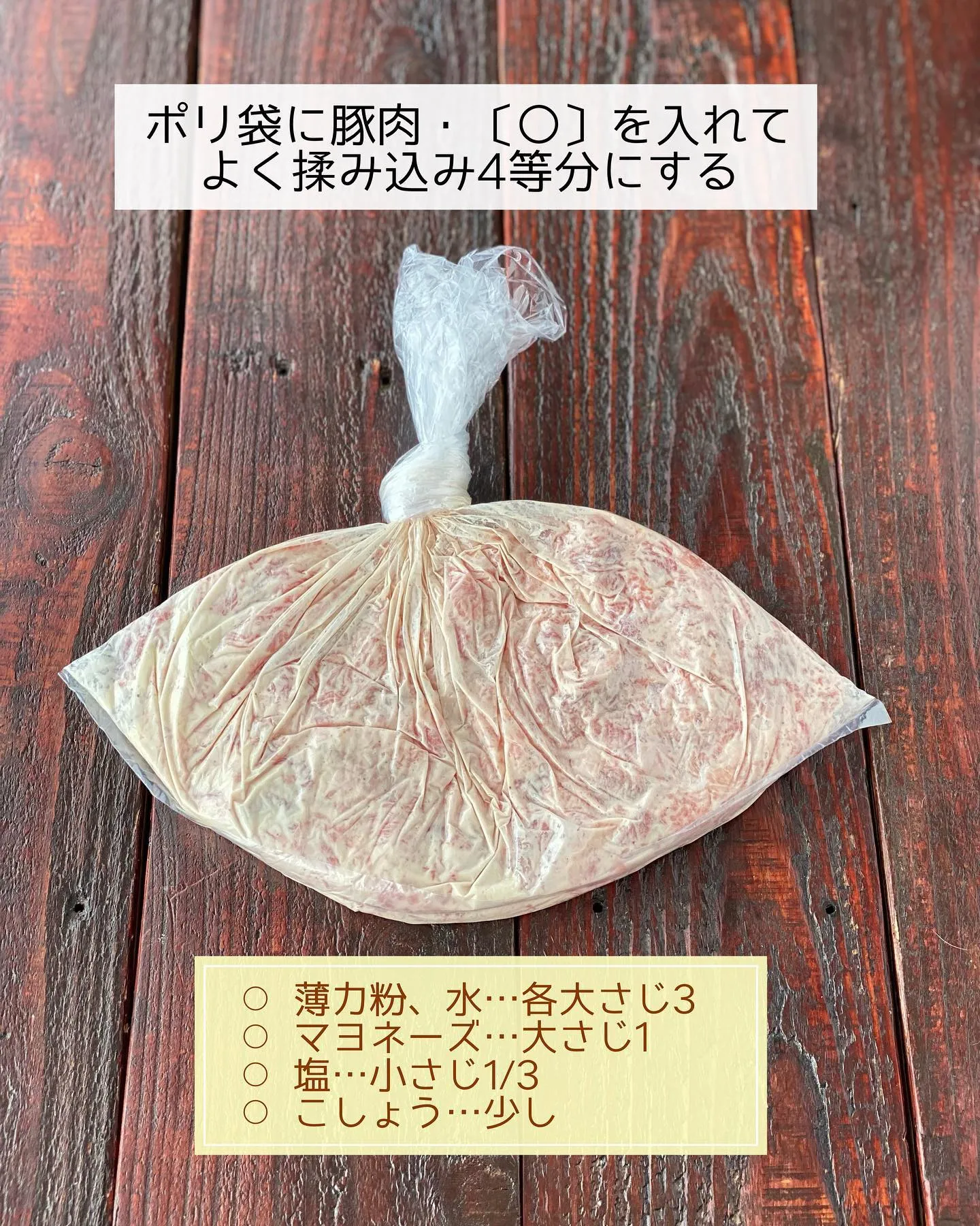 ➋ポリ袋に豚肉・〔○〕を入れてよく揉み込み、𝟺等分にする。