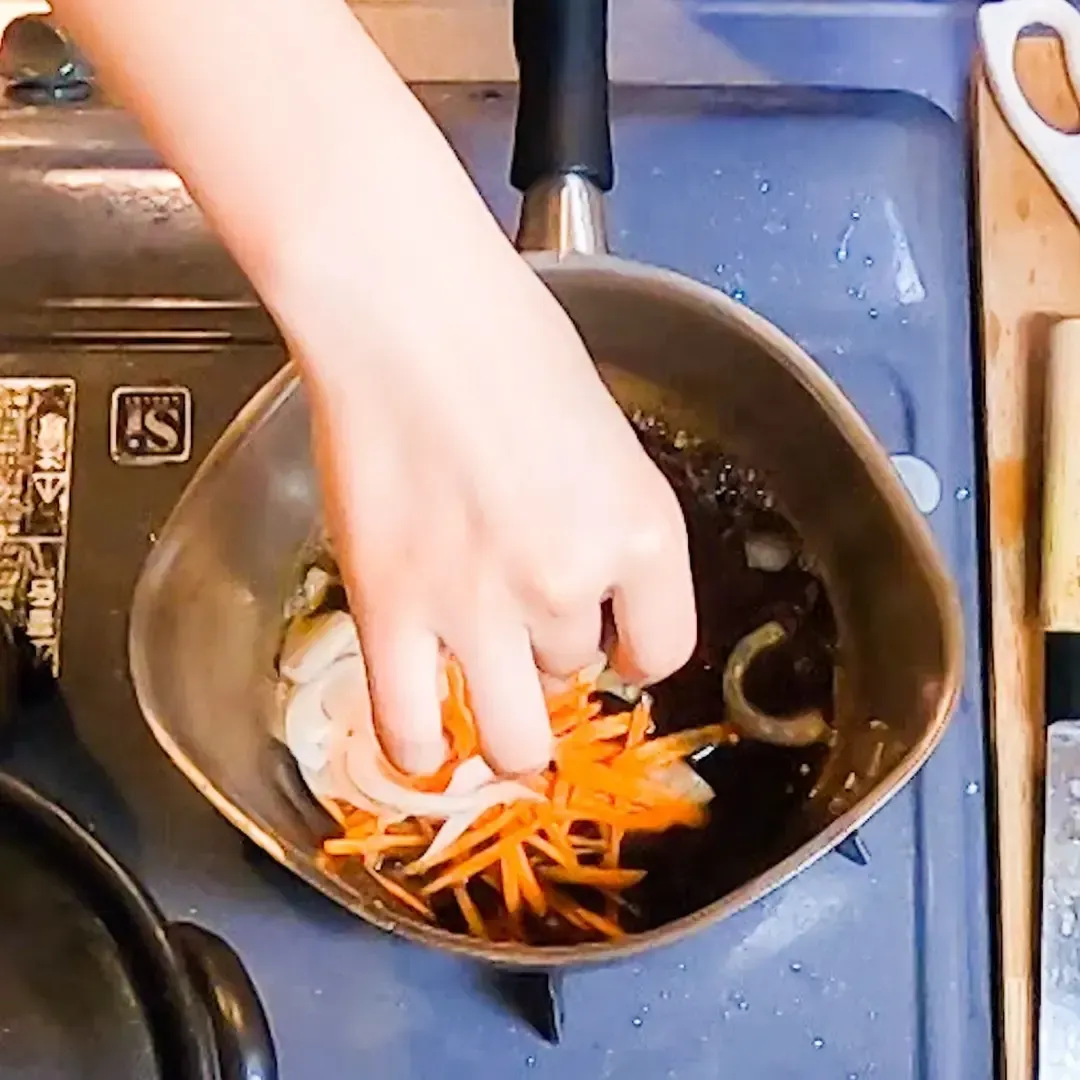 ①にんじん 1/2 本を細切り、玉ねぎ 1/2 個を薄切りにする