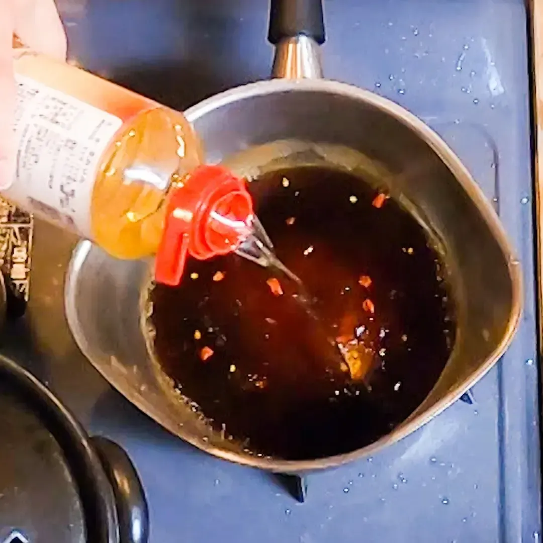 ⑥鍋に柚子ポン酢 50ml、ハサミで切った鷹の爪 2 本、みりん大さじ 1、①を入れ軽く煮る