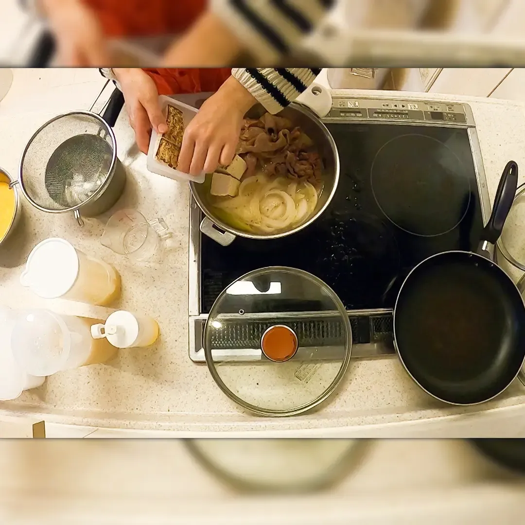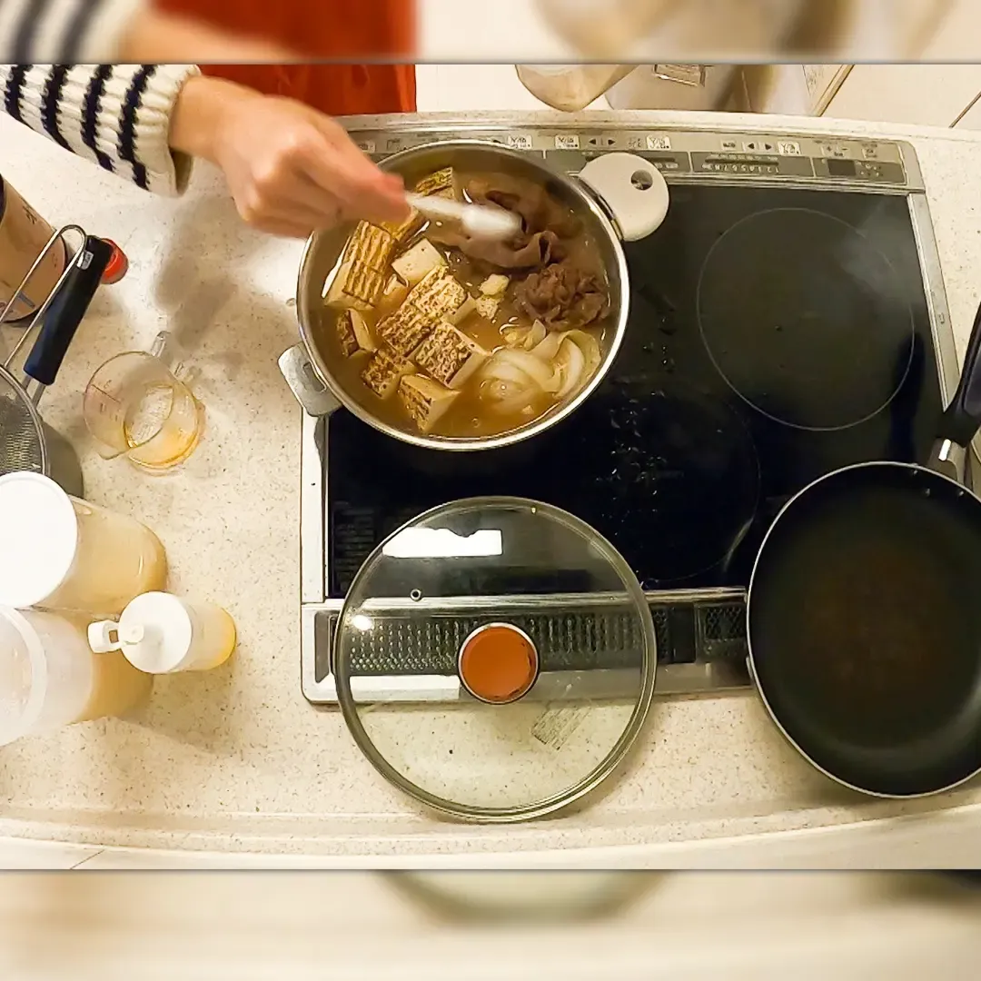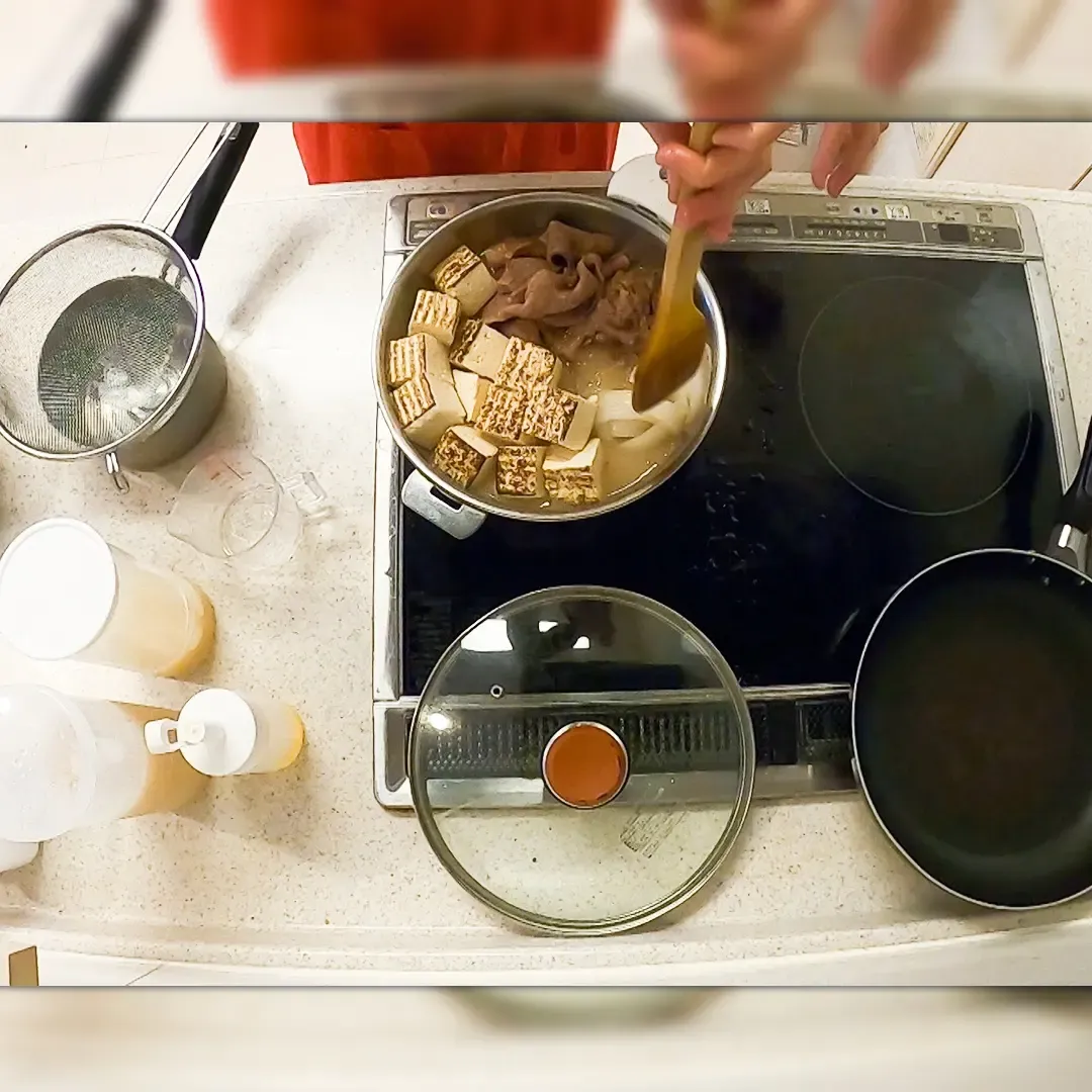 ⑧しょう油 50ml、砂糖大さじ 2 を加え、再度蓋をして煮込む