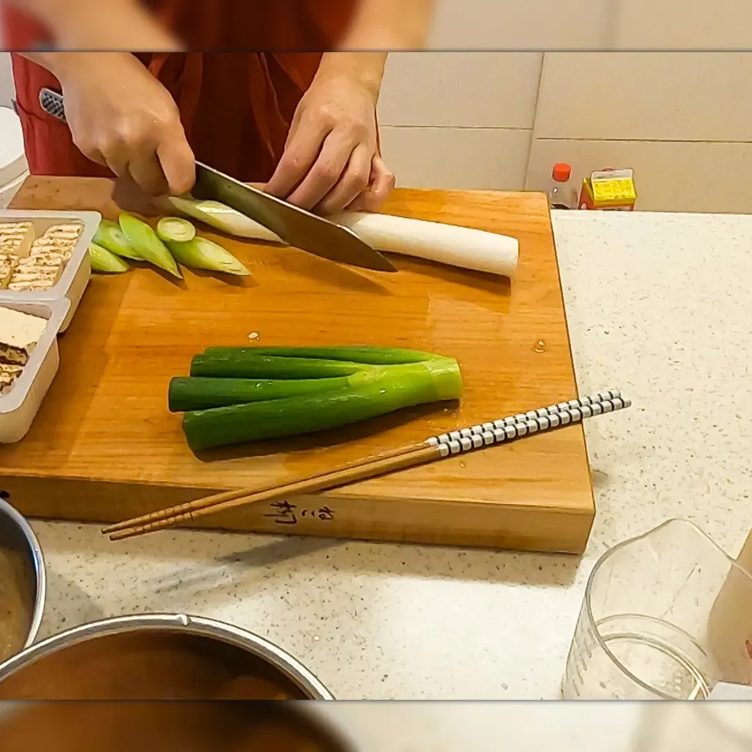 ⑤長ネギ 1 本の白い部分を斜め切りにする