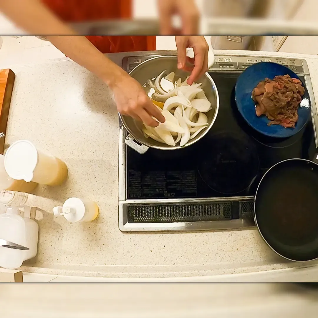 ⑥④が沸騰してきたら、玉ねぎとネギを加えて混ぜ、蓋をして煮込む