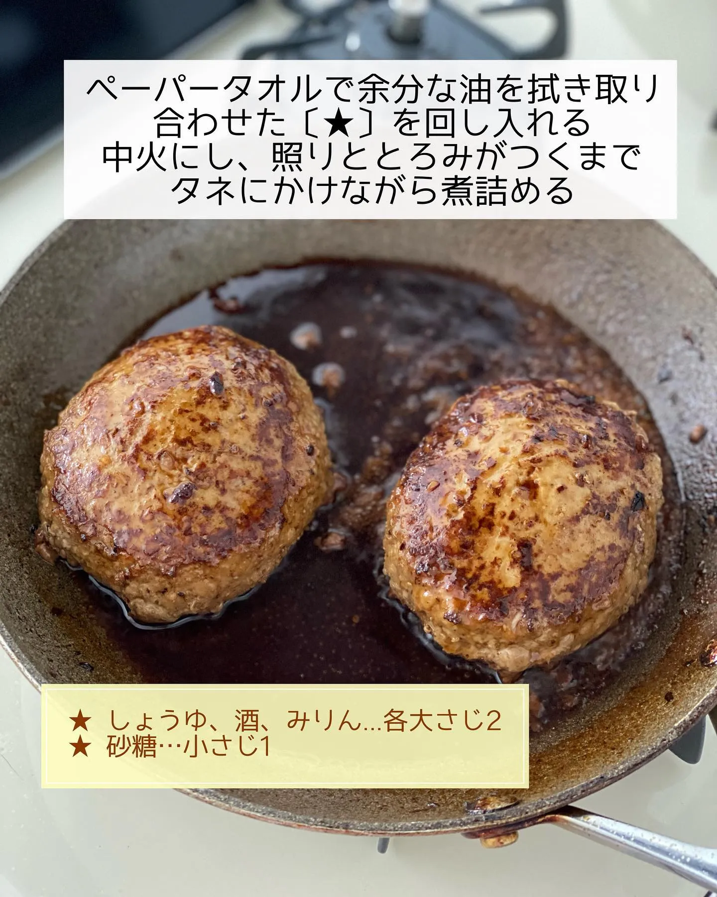 ➍ペーパータオルで余分な油を拭き取り、合わせた〔★〕を回し入れる。中火にし、照りととろみがつくまでタネにかけながら煮詰める。好みで大根おろしを乗せる。