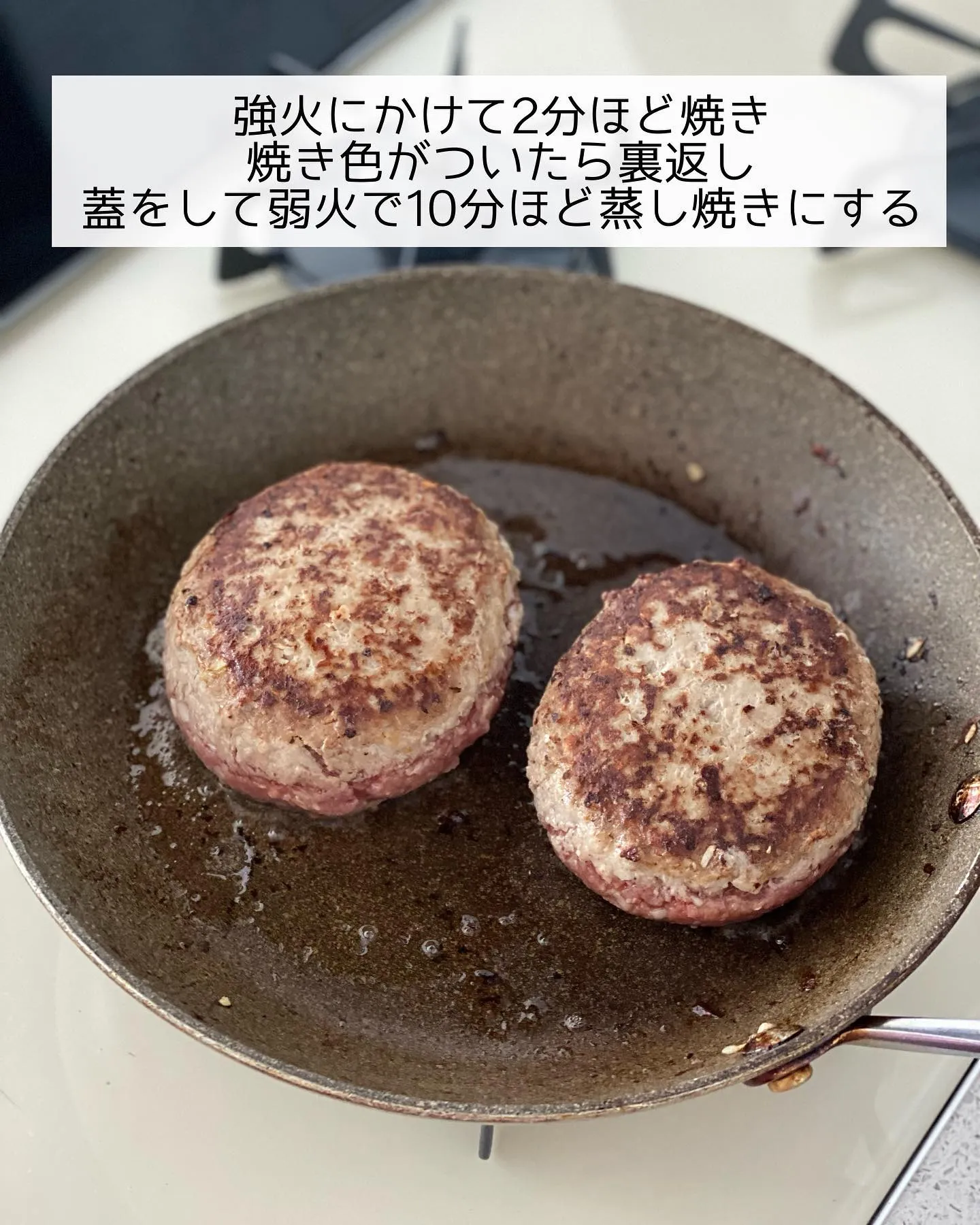 ➌強火にかけて𝟸分ほど焼き、焼き色がついたら裏返し、蓋をして弱火で𝟷𝟶分ほど蒸し焼きにする。