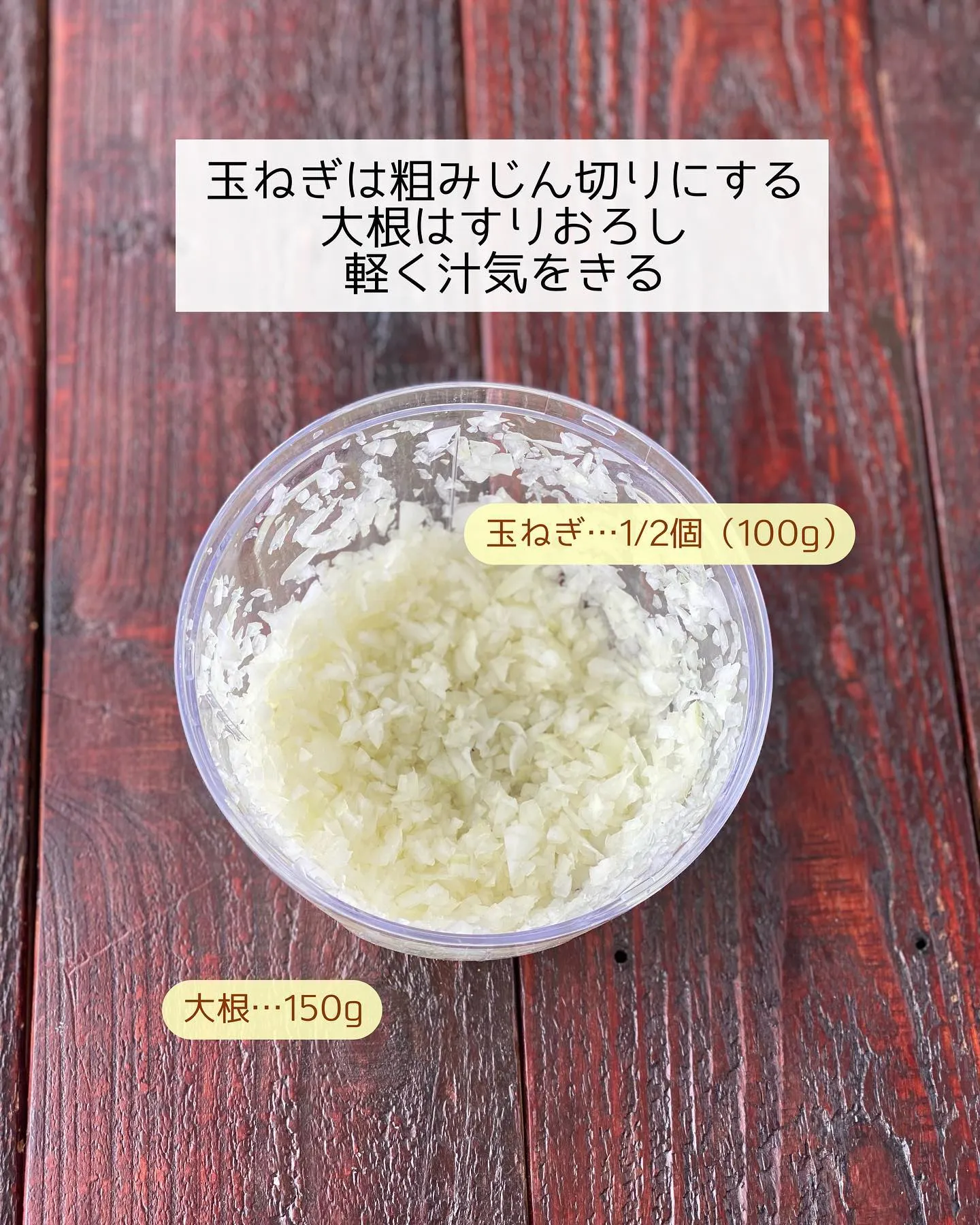 ➊玉ねぎは粗みじん切りにする。大根はすりおろし、軽く汁気をきる。