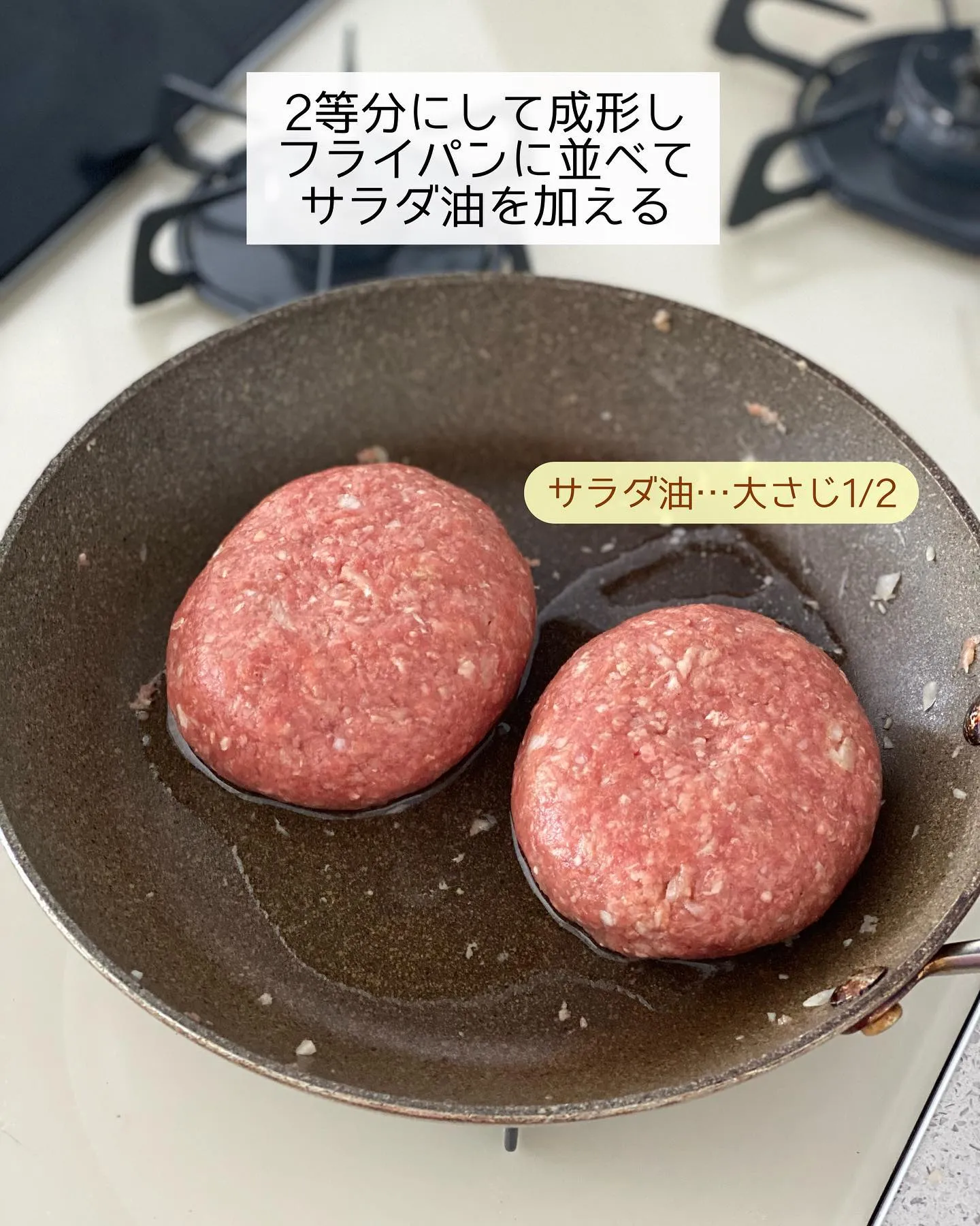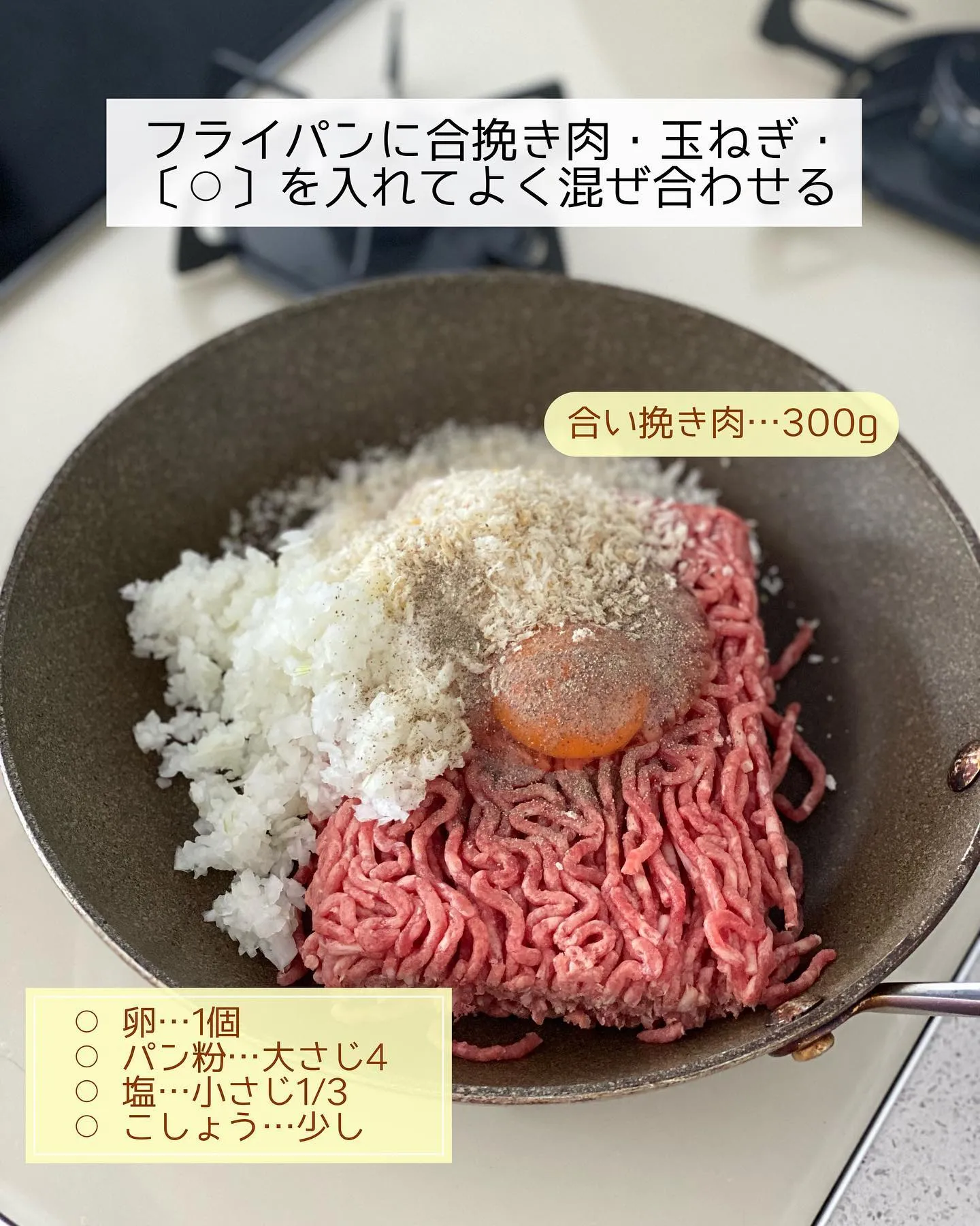➋フライパンに合挽き肉・玉ねぎ・〔⚪︎〕を入れてよく混ぜ合わせる。𝟸等分にして成形し、フライパンに並べてサラダ油を加える。