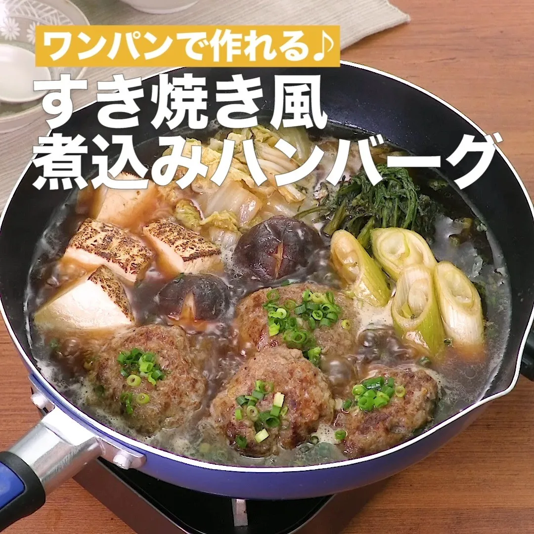 ⑦<ワンパンで作れる♪すき焼き風煮込みハンバーグ>