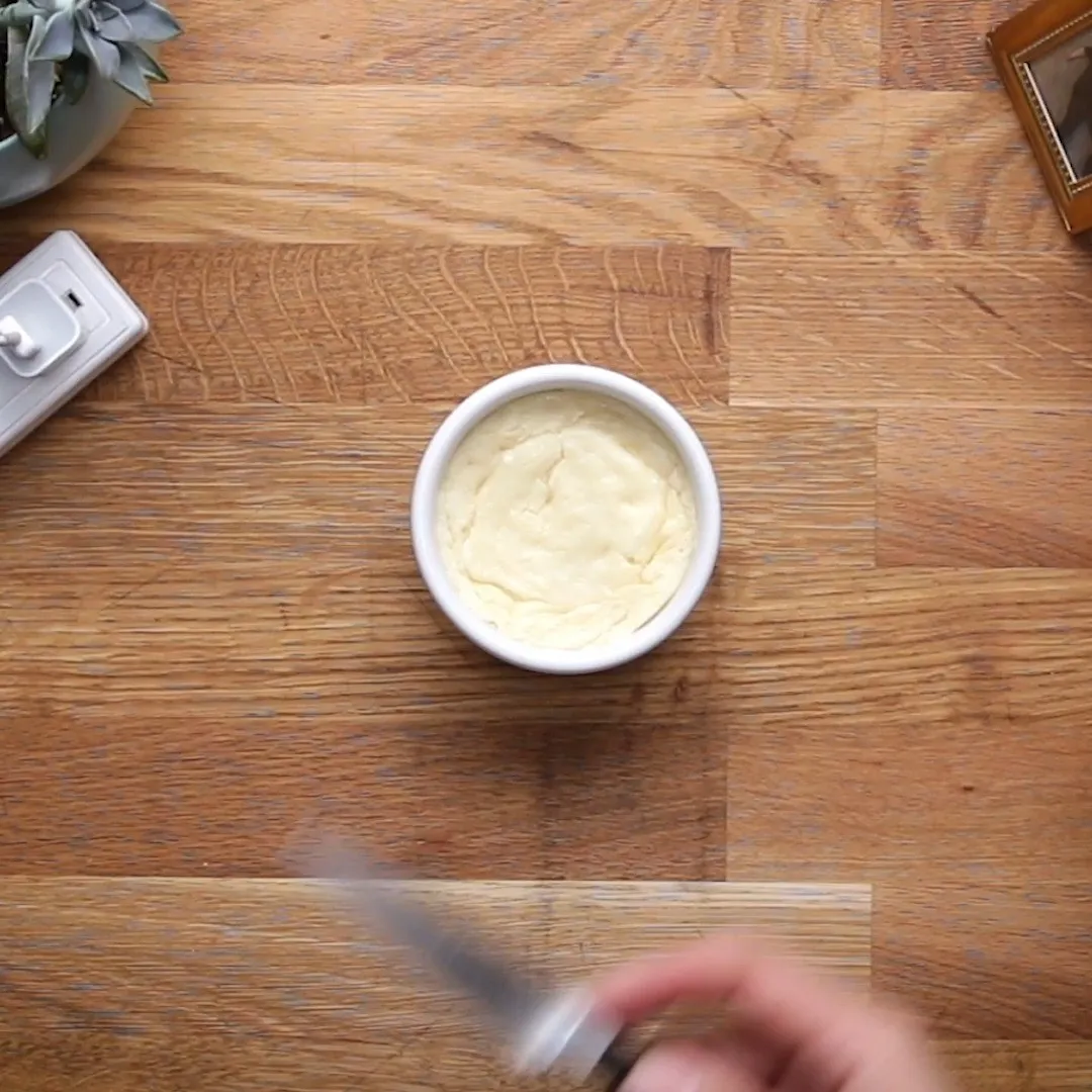 1.耐熱のココットにバターを入れ、600Wのレンジで30秒ほど加熱して溶かす。バターが溶けたら、容器を傾けながら側面にもバターを塗る。