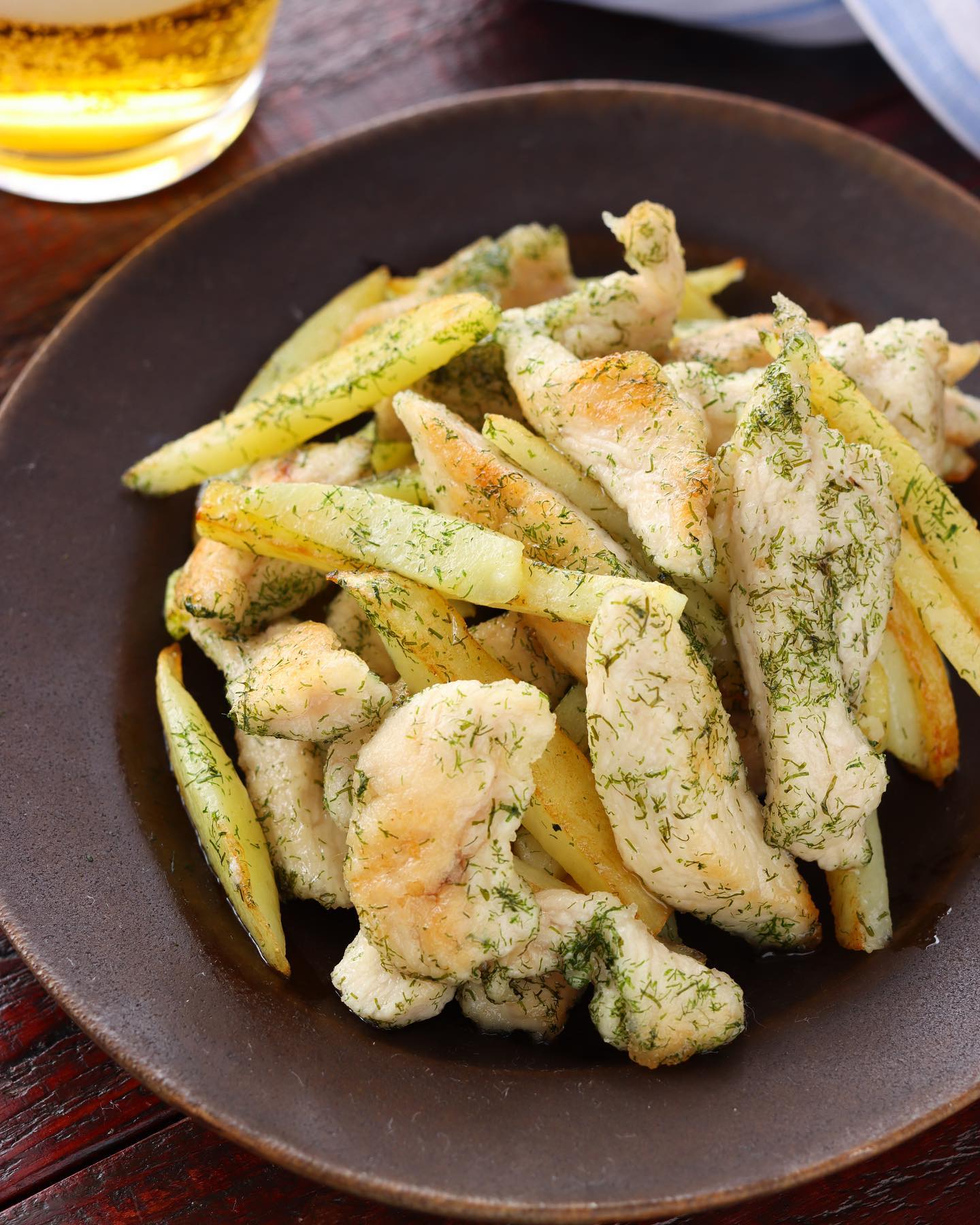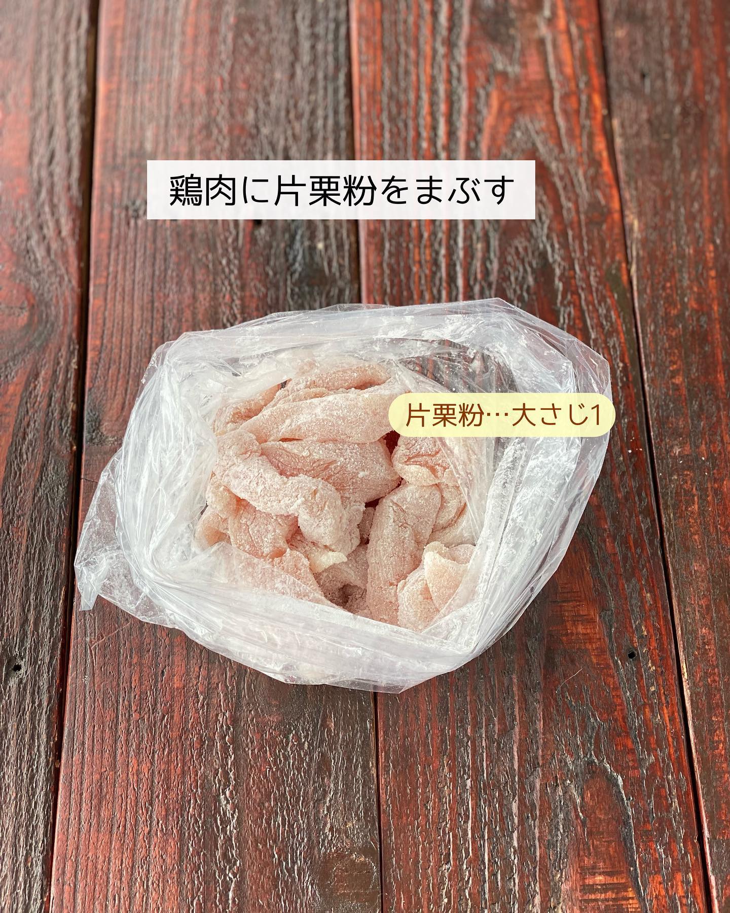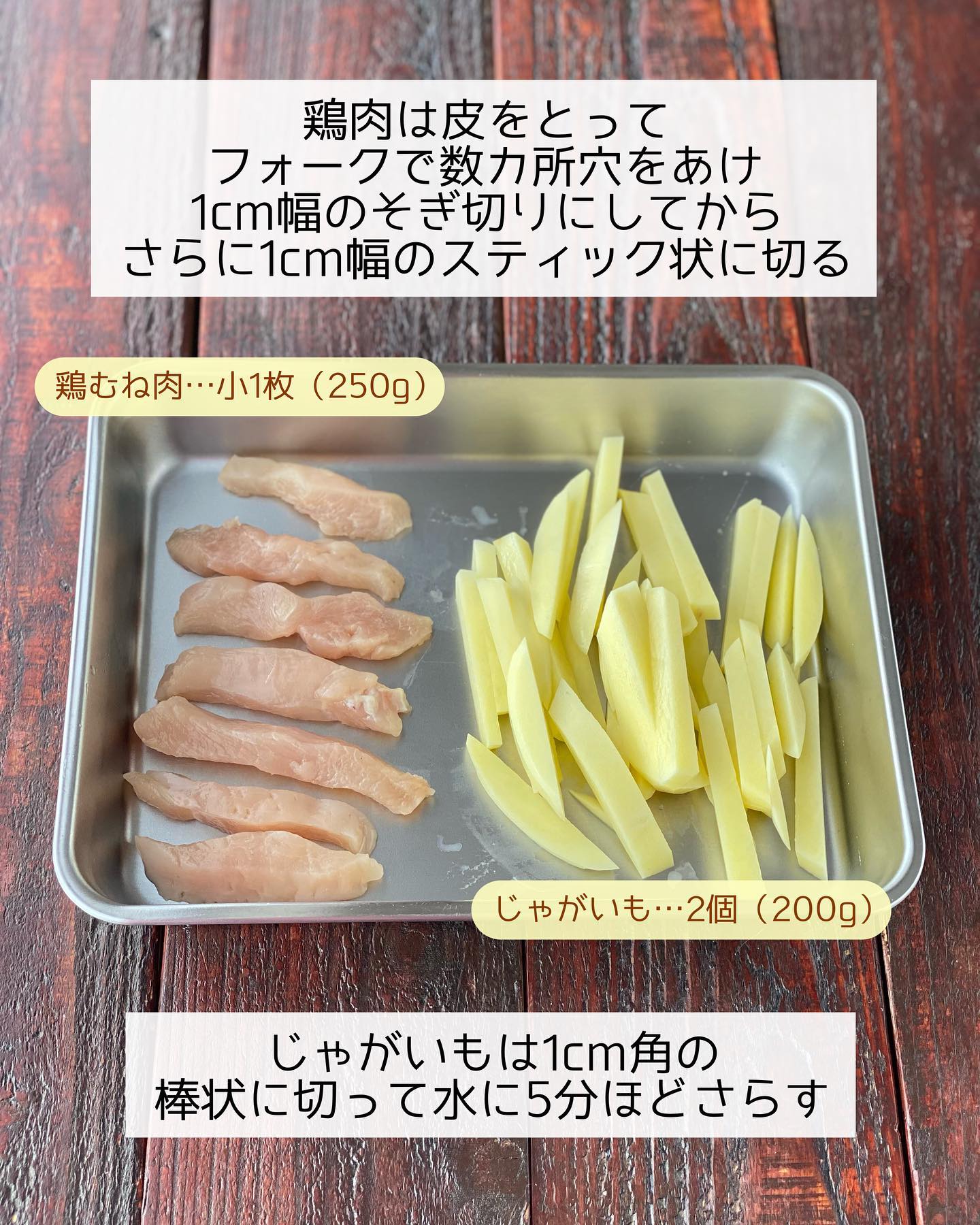 ➊鶏肉は皮をとってフォークで数カ所穴をあけ、𝟷𝚌𝚖幅のそぎ切りにしてから、さらに𝟷𝚌𝚖幅のスティック状に切り、片栗粉をまぶす。じゃがいもは𝟷𝚌𝚖角の棒状に切って水に𝟻分ほどさらす。