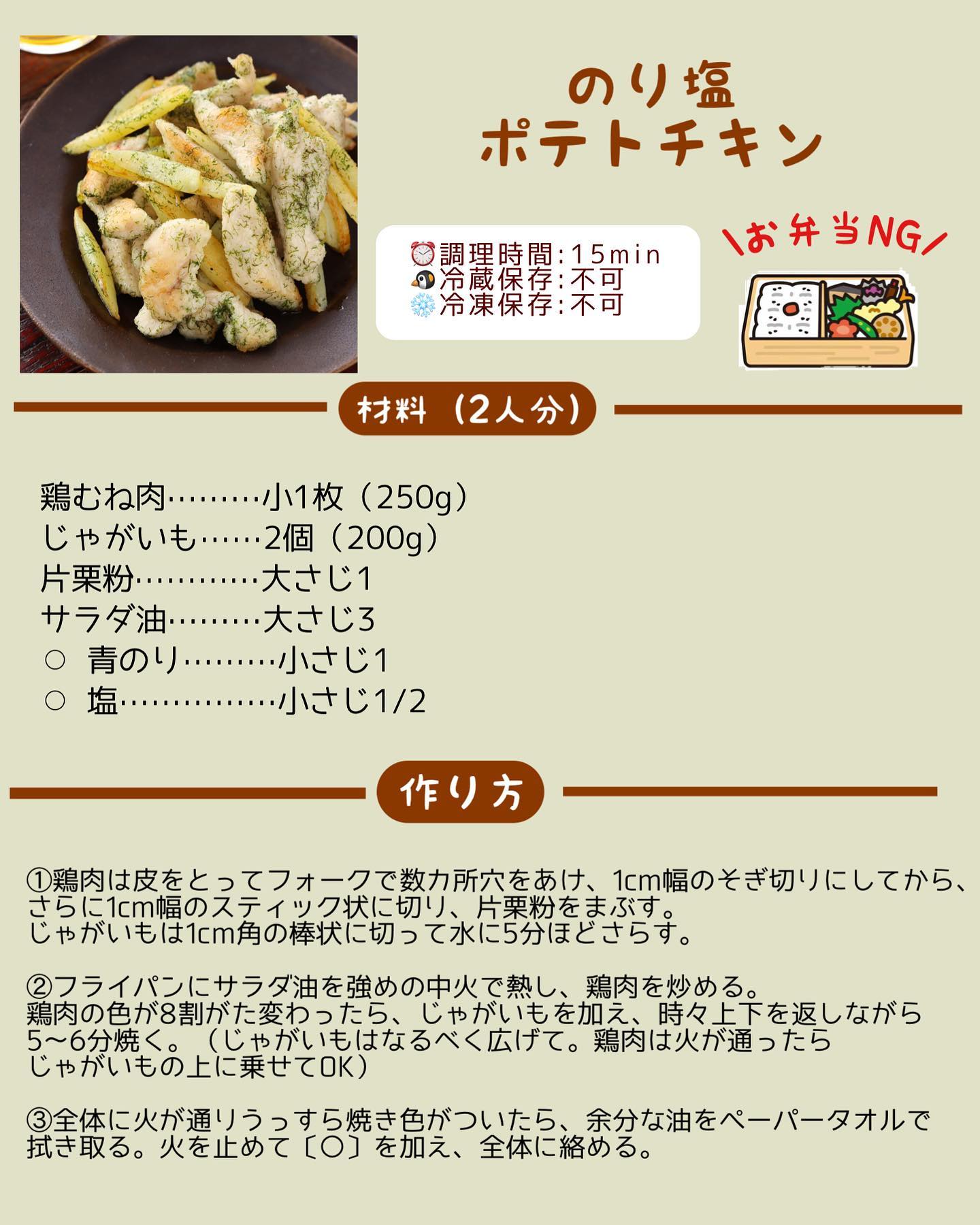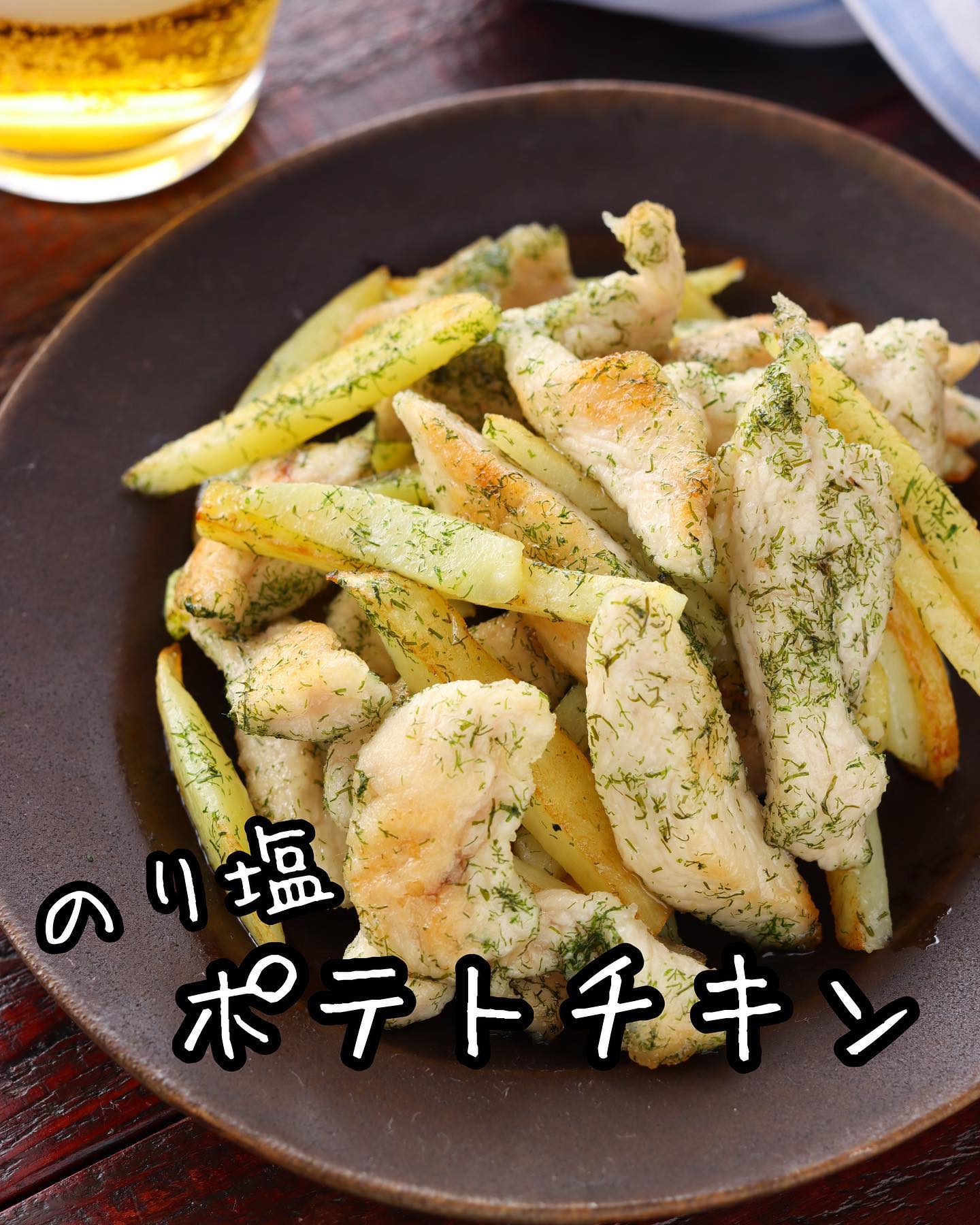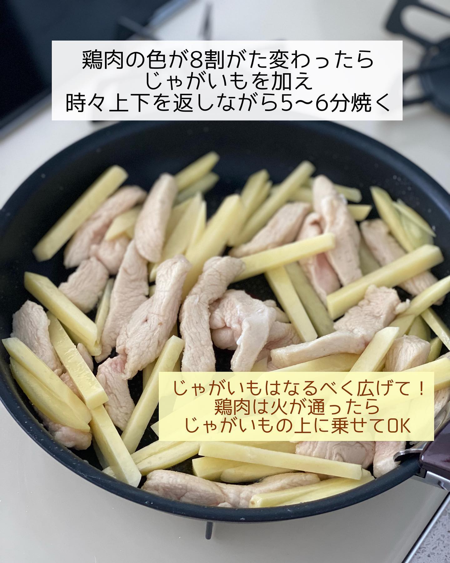 ➋フライパンにサラダ油を強めの中火で熱し、鶏肉を炒める。鶏肉の色が𝟾割がた変わったら、じゃがいもを加え、時々上下を返しながら𝟻〜𝟼分焼く。(じゃがいもはなるべく広げて。鶏肉は火が通ったらじゃがいもの上に乗せて𝙾𝙺)
