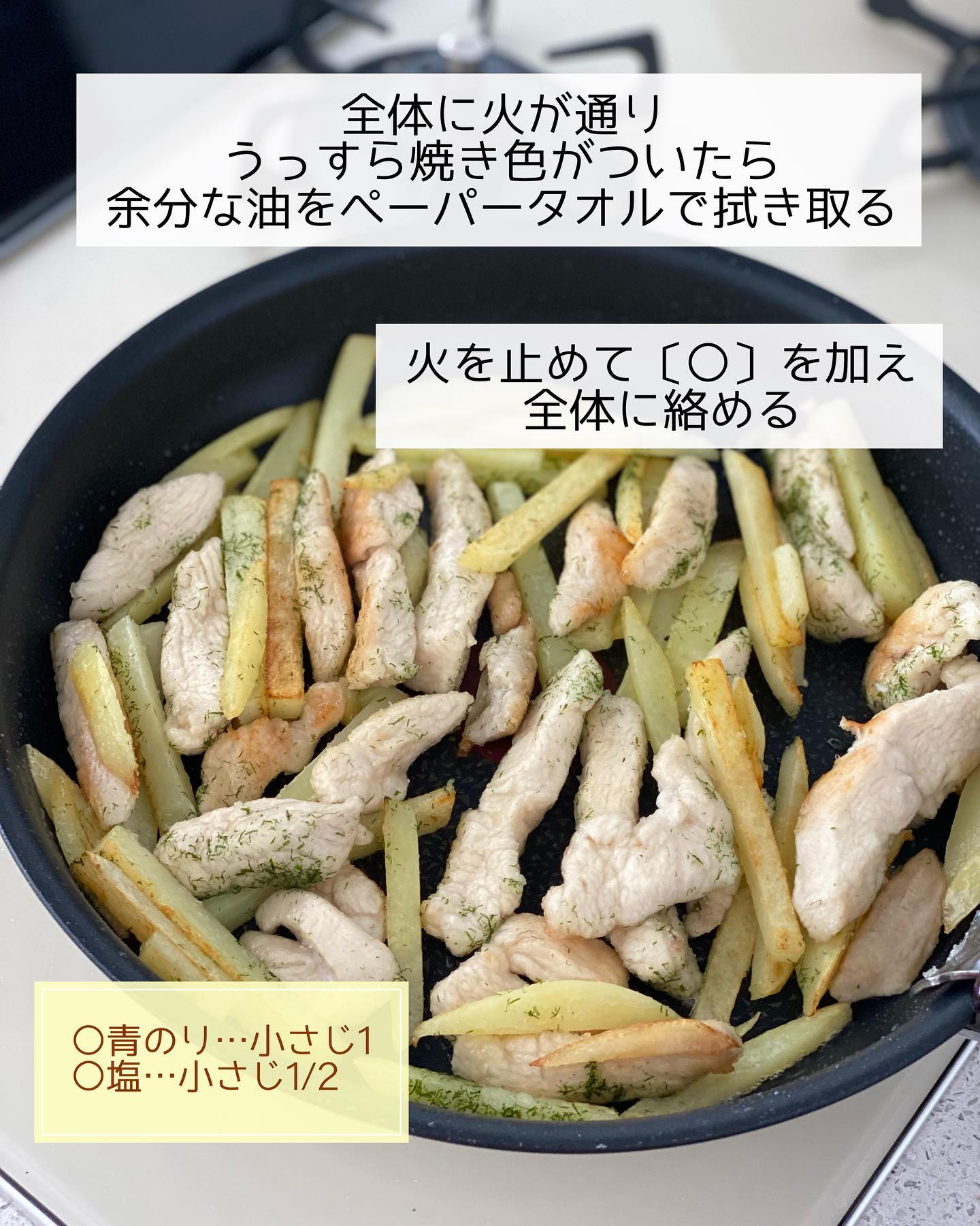 🔸じゃがいもを加えたら必要以上に触らず、じっくり焼くのがポイント!じゃがいもがカリカリになって香ばしさも増します♪