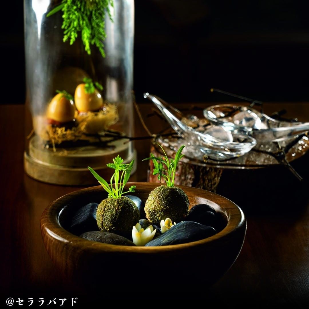 楓の樹液を球状にした「目覚めの涙」、鳥の巣に見立てたカダイフにうずらのたまごやチョリリーをのせた「誕生」が登場。