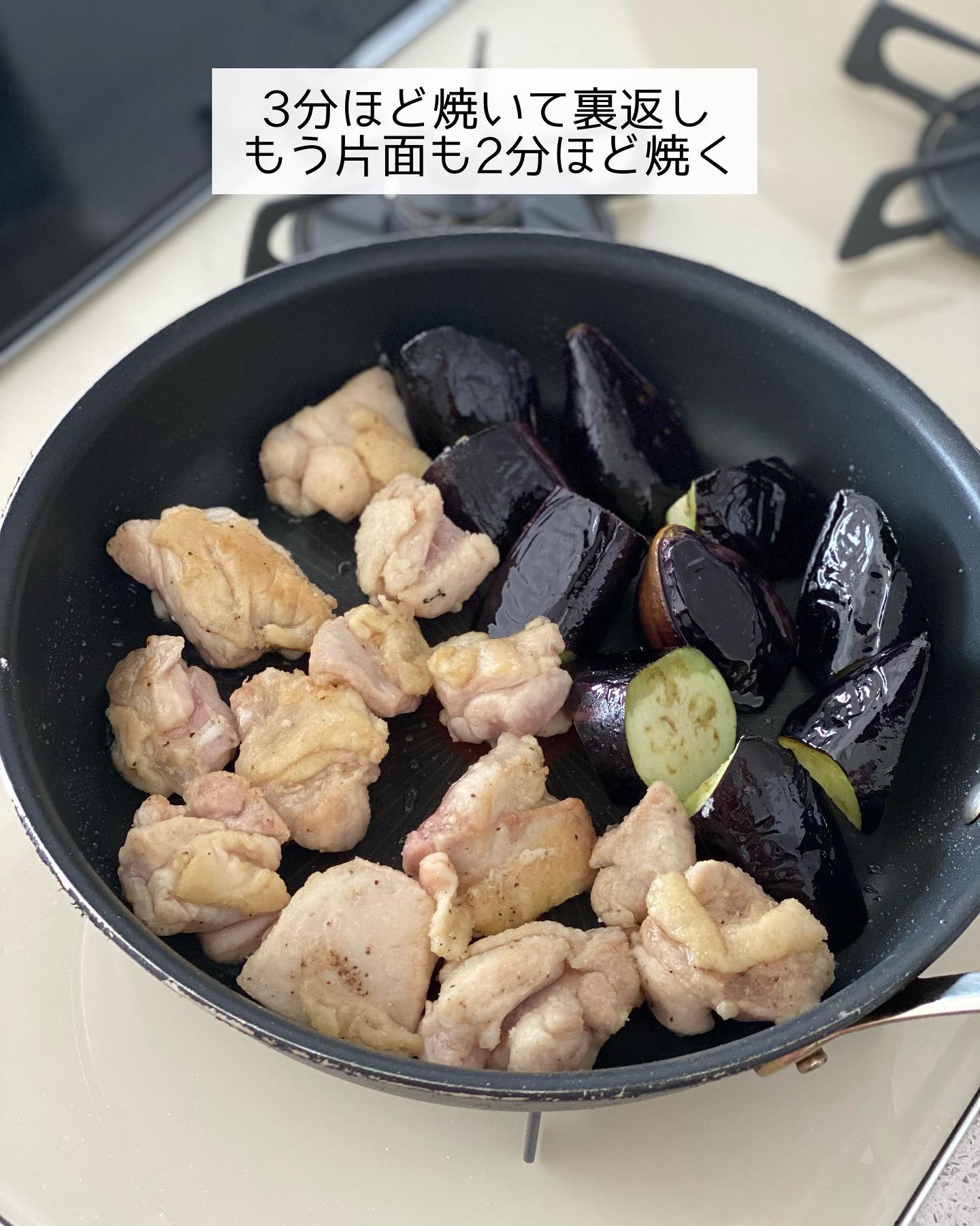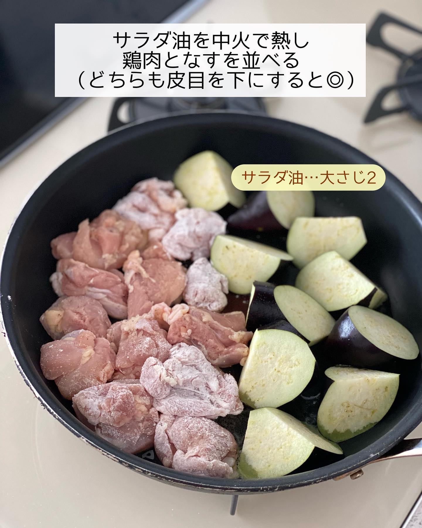 ➋フライパンにサラダ油を中火で熱し、鶏肉となすを並べる(どちらも皮目を下にすると◎)。𝟹分ほど焼いて裏返し、もう片面も𝟸分ほど焼く。