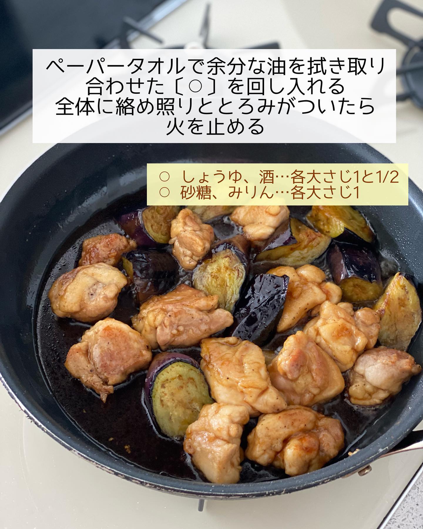 ➌全体に火が通ったら、ペーパータオルで余分な油を拭き取り、合わせた〔⚪︎〕を回し入れる。全体に絡め、照りととろみがついたら火を止める。