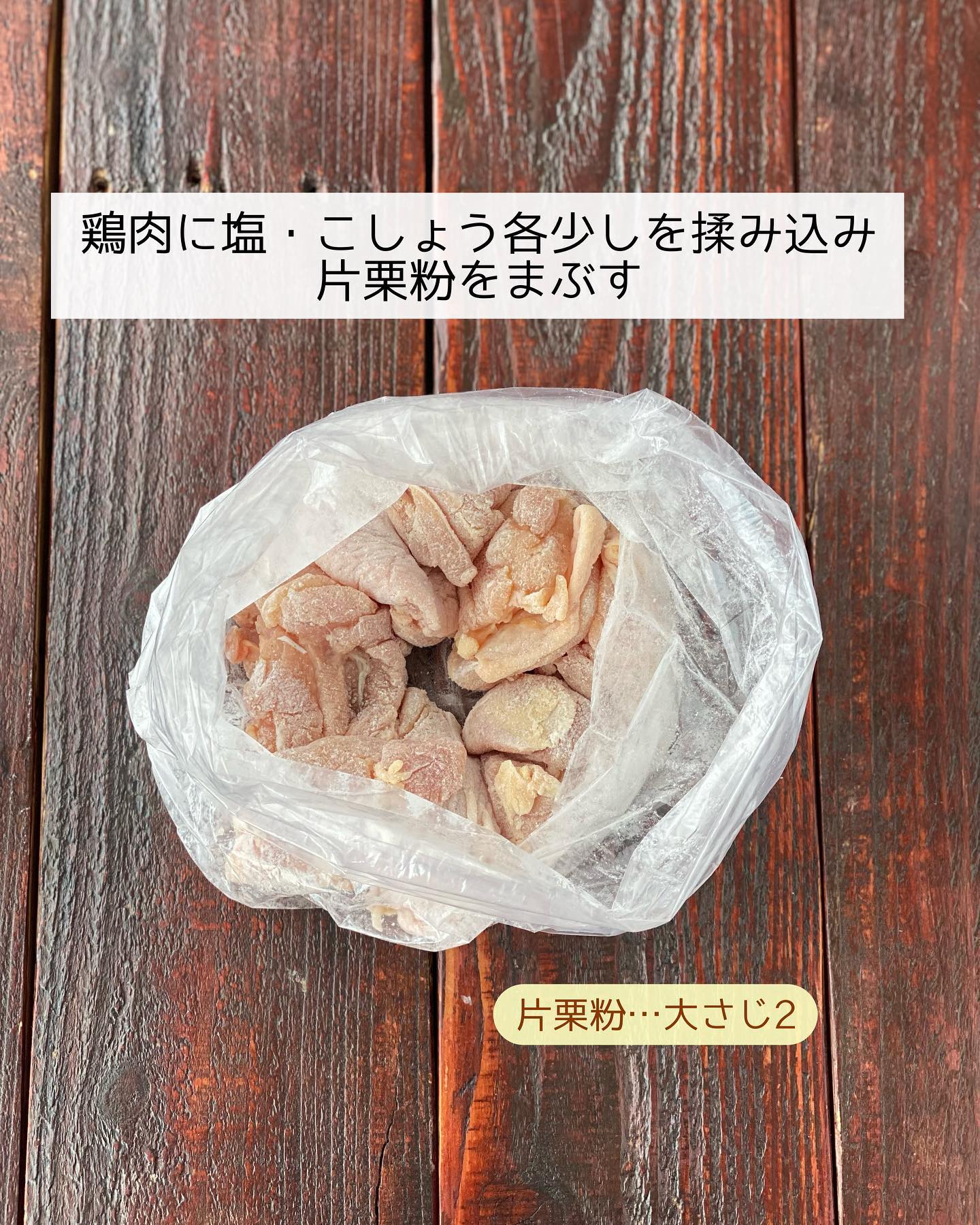 🔸【鶏もも肉】➡︎ 鶏むね肉・鶏ささ身でも可。その場合は、そぎ切りにし下味に酒大さじ𝟷を揉み込んでください