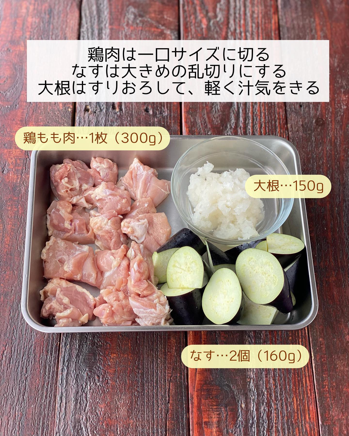 ➊鶏肉は一口サイズに切って塩・こしょうを揉み込み、片栗粉をまぶす。なすは大きめの乱切りにする。大根はすりおろして、軽く汁気をきる。