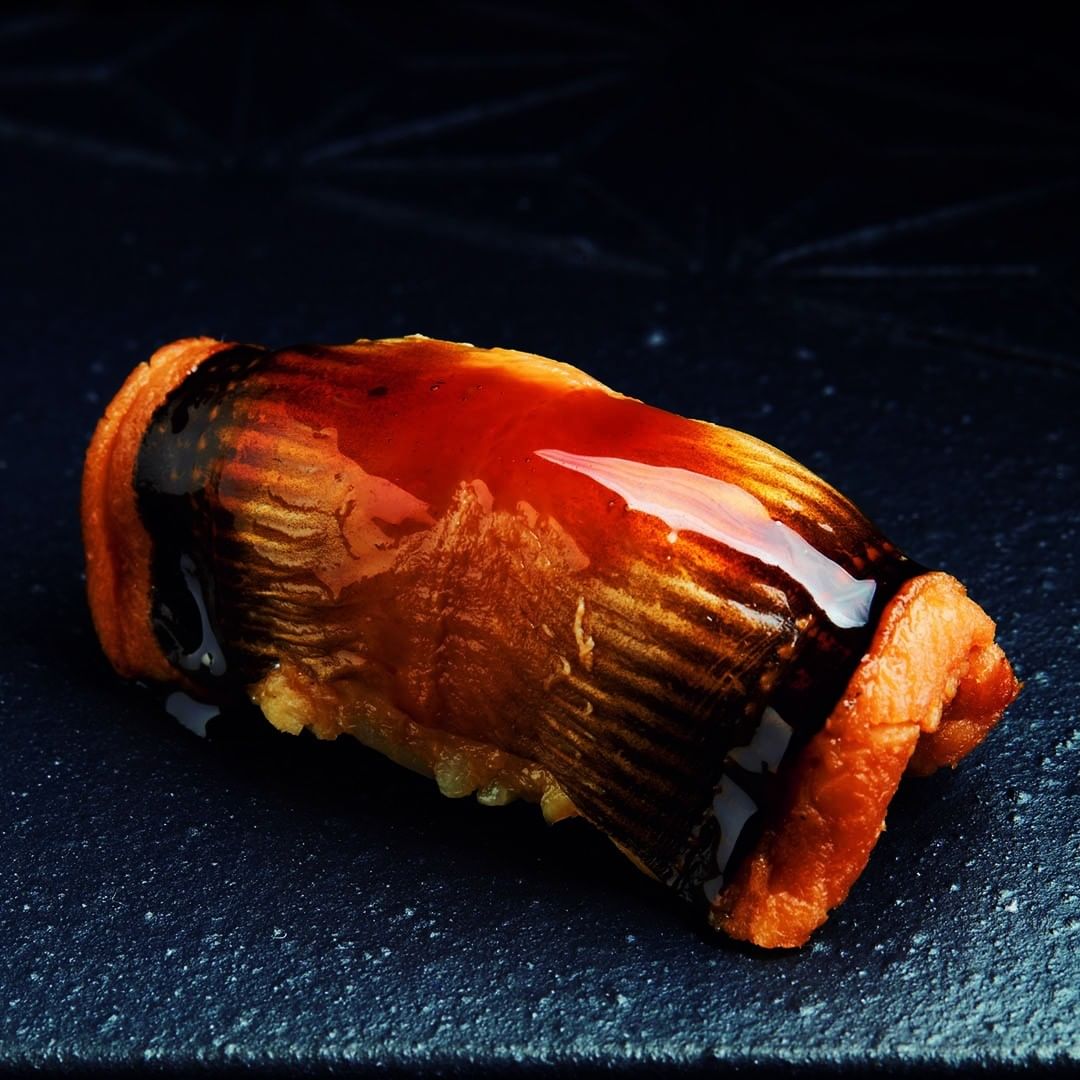 この日の「中トロ」は、宮城県塩釜で採れた本まぐろ。こちらのユニークな佇まいは、”鞍掛け”という握り方だ。香り高い”血合いぎし”という部位を使用していて、濃厚な旨みをダイレクトに楽しめる。