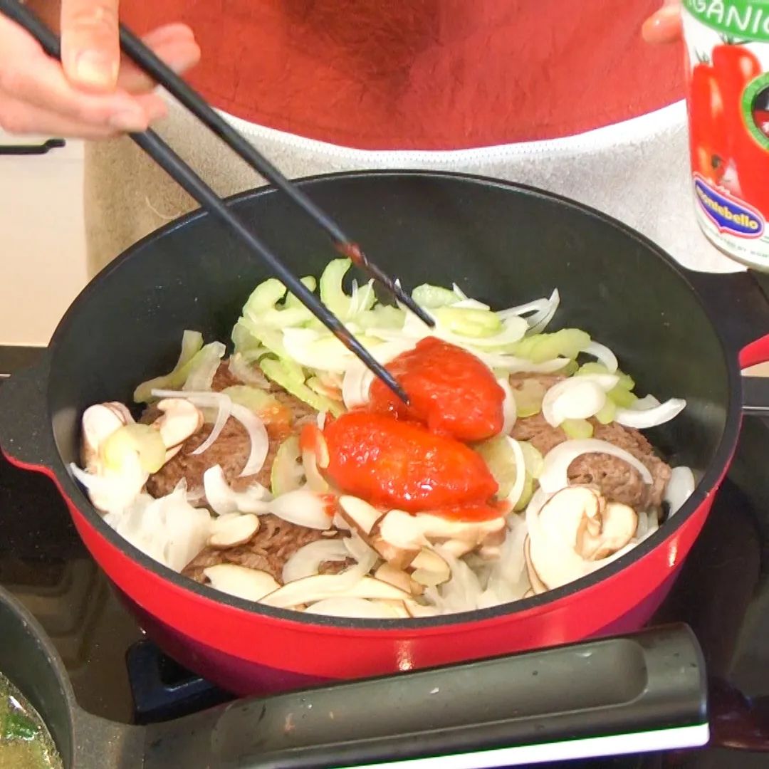 ⑦フライパンに⑥を加え、フライパンを振り馴染ませ、蓋をして4分煮込む