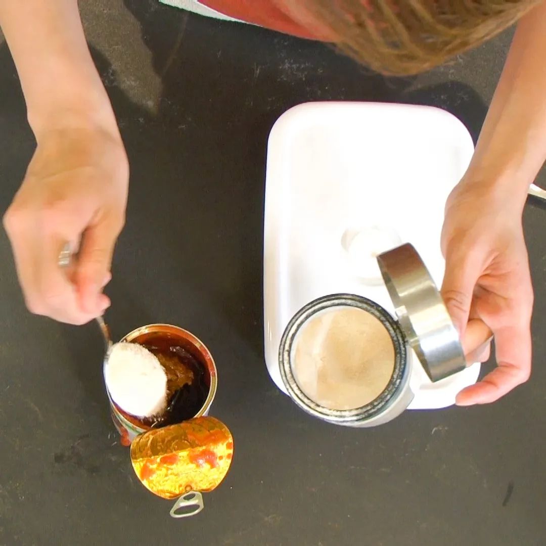 ⑥残りのトマト缶に、味噌大さじ2、しょう油と砂糖大さじ1、にんにく1片をすりおろして加え、しっかり混ぜてソースを作る