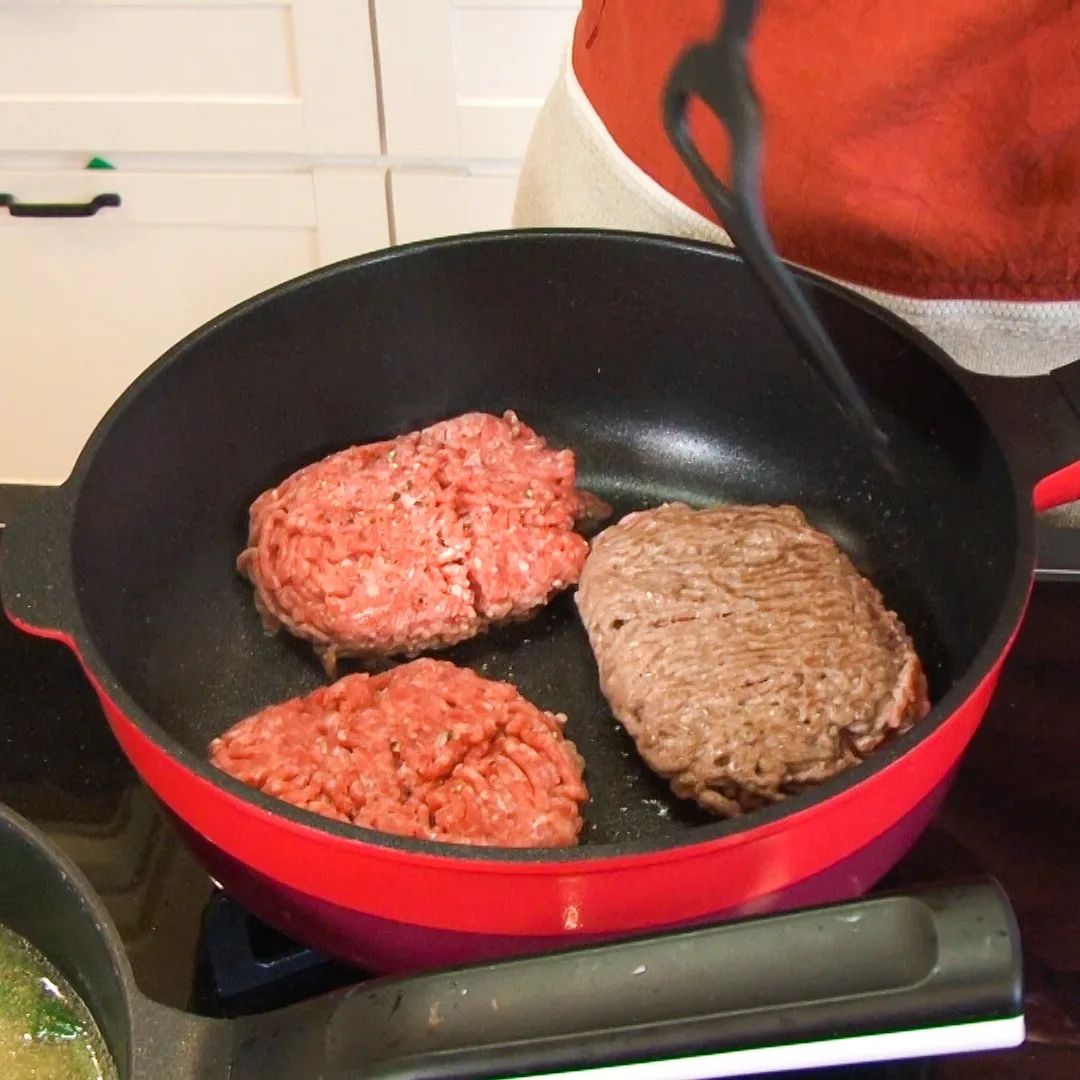 ③フライパンにひき肉を入れ、コショウ少々・塩ひとつまみをかけ中火にかける。焼き色がついたら上下を返して両面に焼き色をつけ、ペーパーで肉から出た脂をふき取る