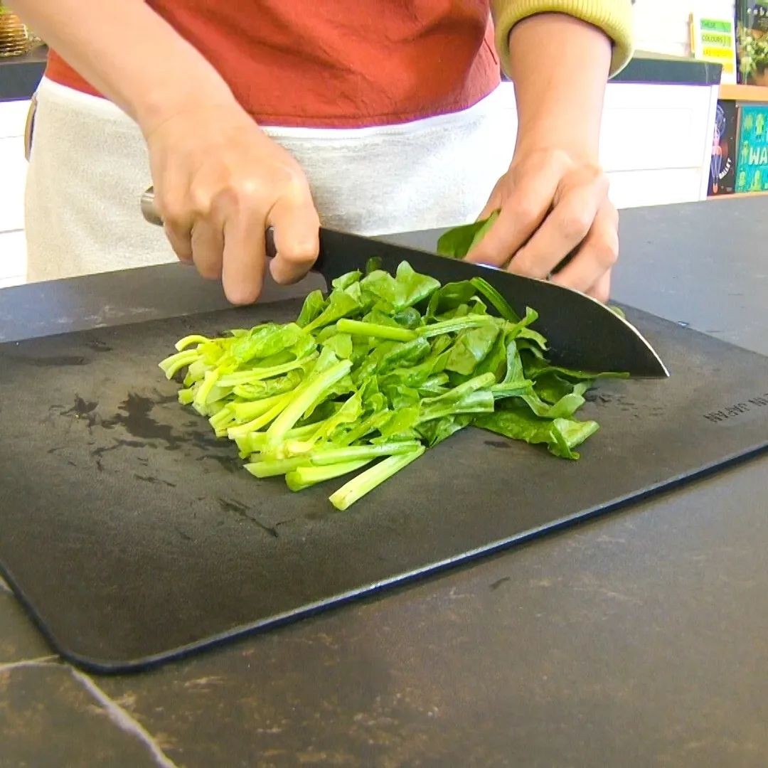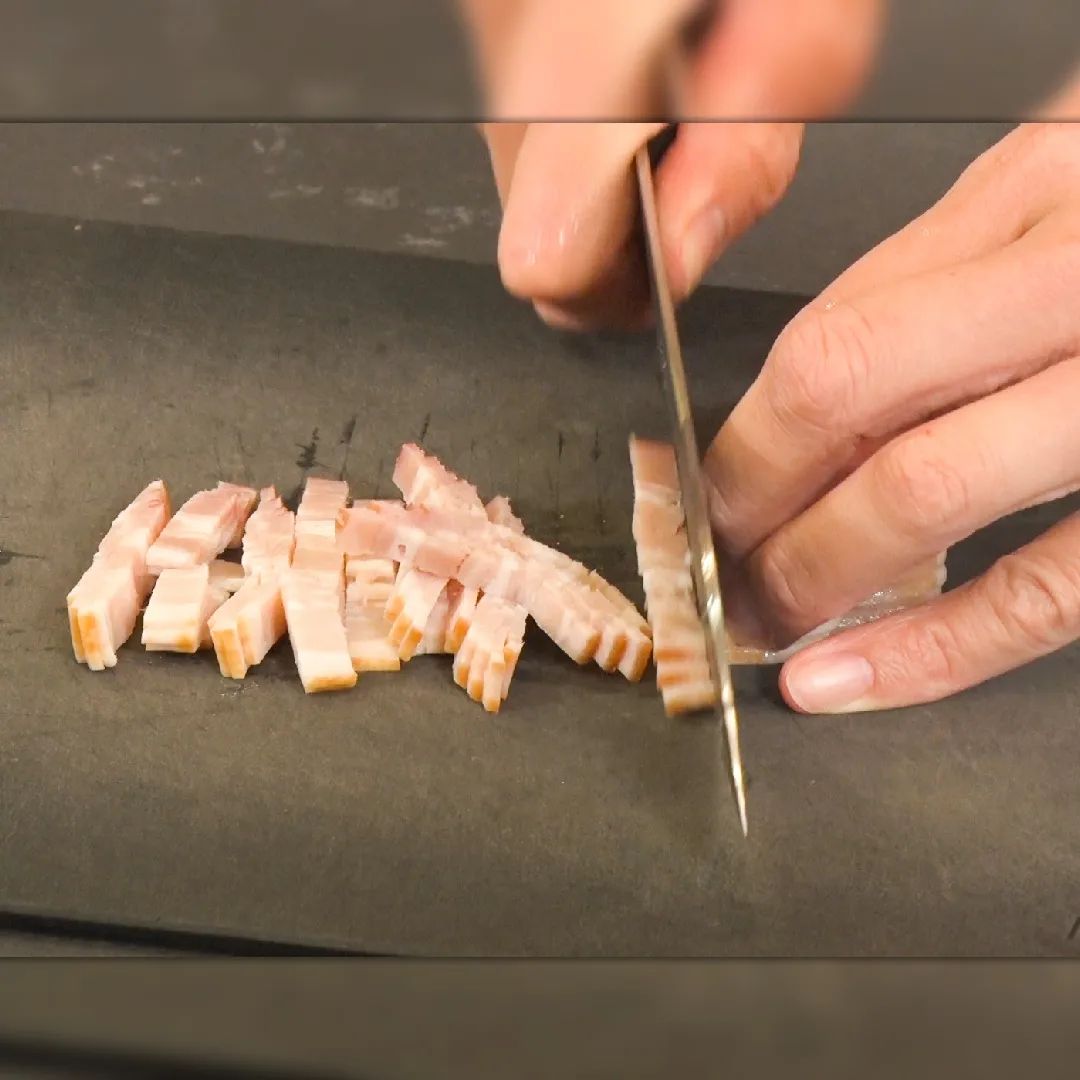 ①ハーフベーコン3枚は細切り、ほうれん草1/2把はざく切りにする