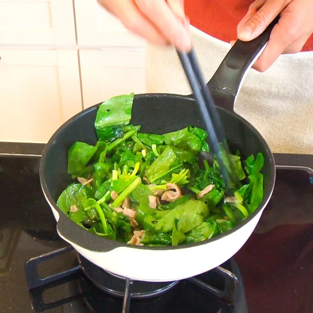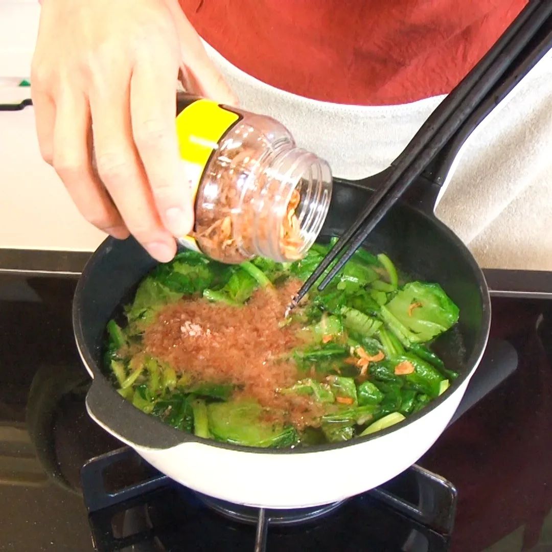 ③ほうれん草を入れ炒め、しんなりしたら水 600ml、鰹節1パックを細かくして加え