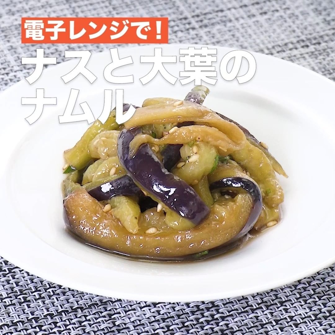 (1)大葉は千切りにする。なすはへたを切り落として縦2等分に切り、水にくぐらせて元の形に戻してラップに包み、600Wのレンジで2〜3分加熱する。そのまま冷水にとって冷まし、水気をとり、食べやすい大きさにさく。