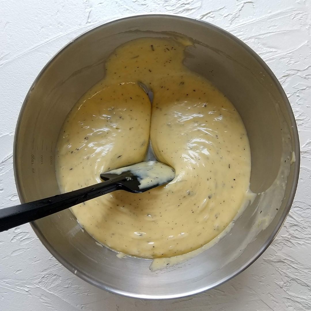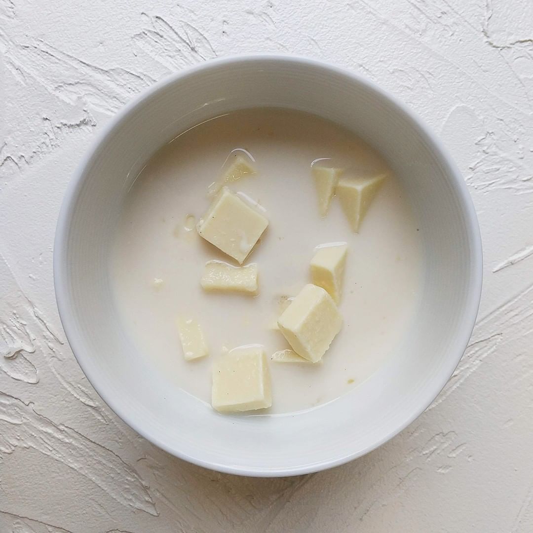 2. ホワイトチョコ・牛乳・グラニュー糖は電子レンジ600Wで2分温め、全体をしっかりと混ぜ合わせ、粗熱が取れたらた卵を混ぜる。