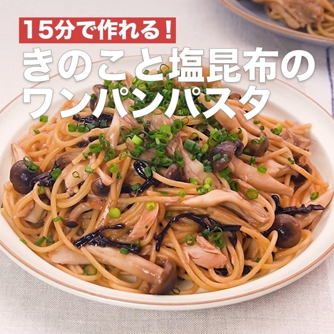 ①<15分で作れる!きのこと塩昆布のワンパンパスタ>