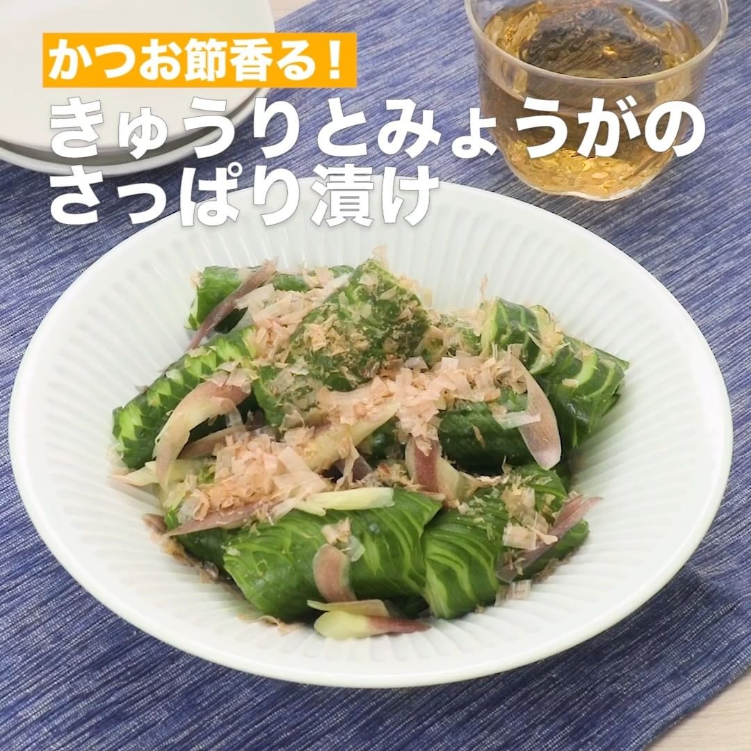 蛇腹切りのきゅうりを使った漬物をご紹介♪きゅうりに一手間加えることで味がしみやすくなります。みょうがを入れてさっぱり感を出し、かつお節を加えると旨味がアップ♪箸休めにもおすすめの一品です!