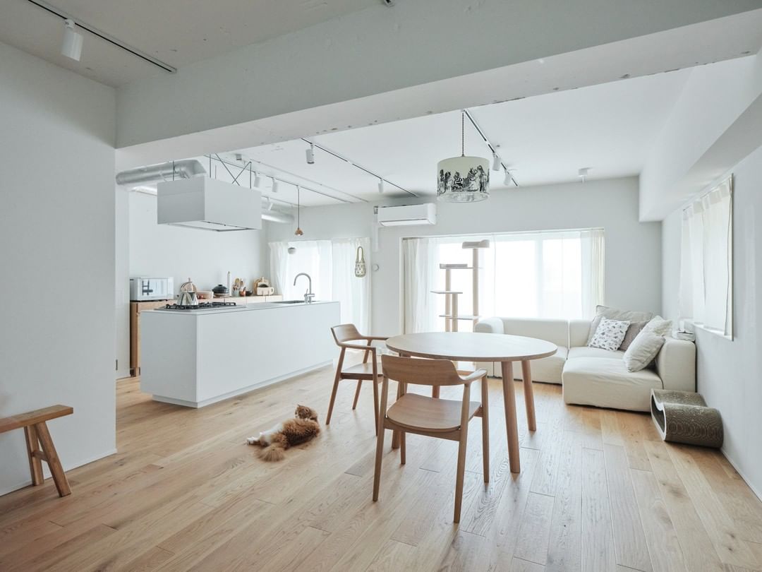 埼玉県所沢市の市街地にあるマンションの一室。Uさんご夫妻の住まいは、「MUJI INFILL 0」によってリノベーションされたお宅です。床材や家具、小物が木製で揃えられた統一感のある広々としたリビングでは、2匹の猫たちが遊んでいます。