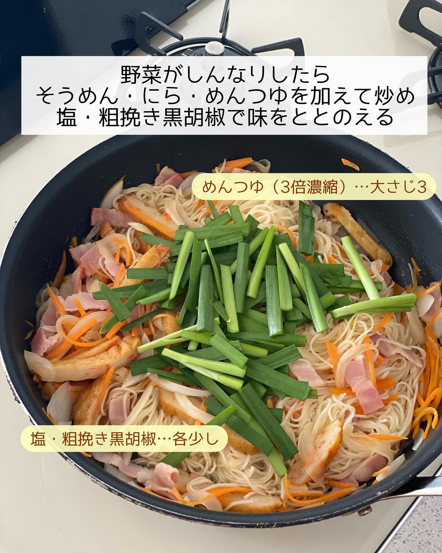 ➌フライパンにごま油大さじ𝟷を中火で熱し、野菜揚・ベーコン・玉ねぎ・にんじんを炒める。野菜がしんなりしたら1・にら・めんつゆを加えて炒め、塩・粗挽き黒胡椒で味をととのえる。お好みでかつお節を乗せて召し上がれ〜♩