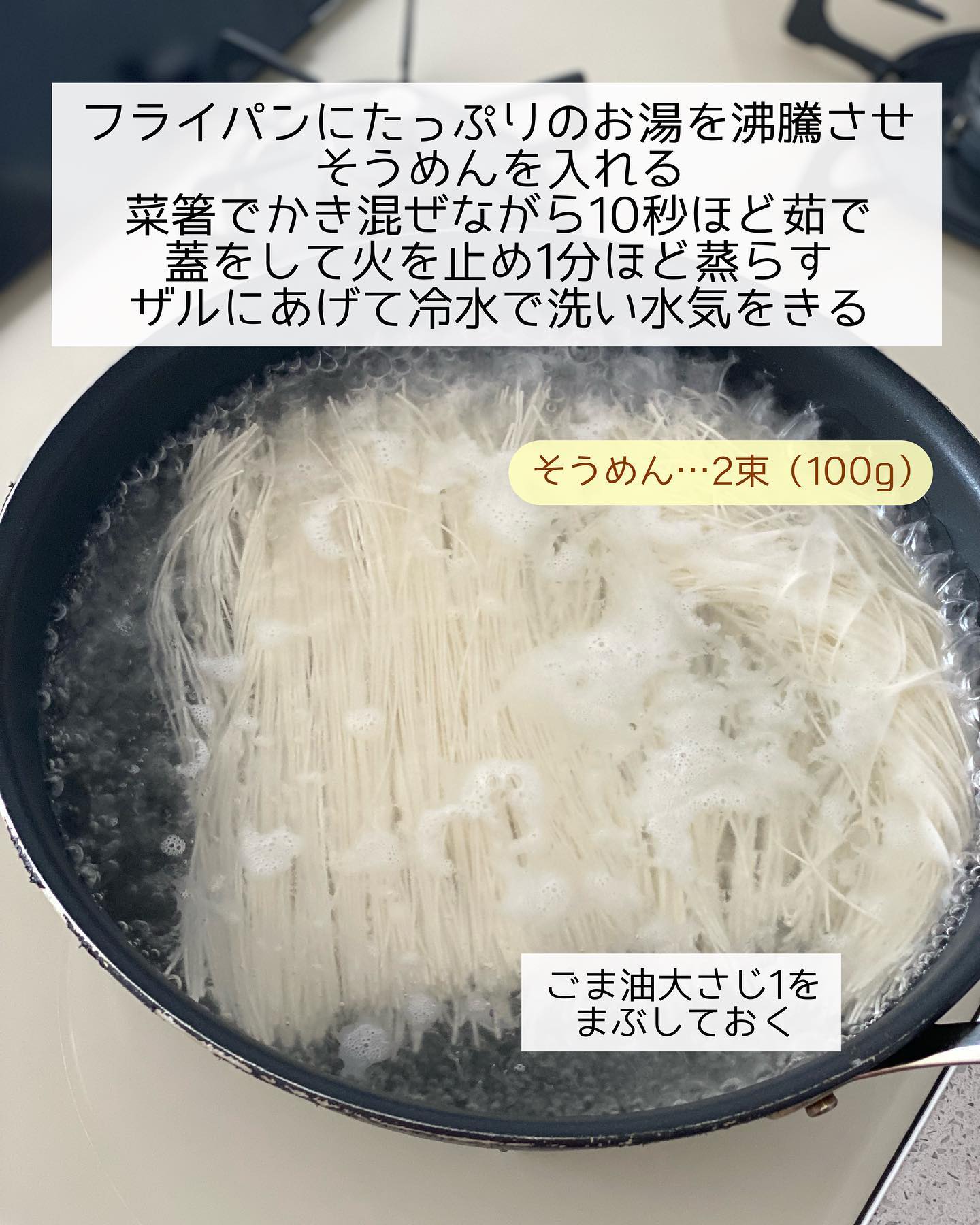 ➊フライパンにたっぷりのお湯を沸騰させ、そうめんを入れる。菜箸でかき混ぜながら𝟷𝟶秒ほど茹で、蓋をして火を止め𝟷分ほど蒸らす。ザルにあげて冷水で洗い水気をきり、ごま油大さじ𝟷をまぶしておく。