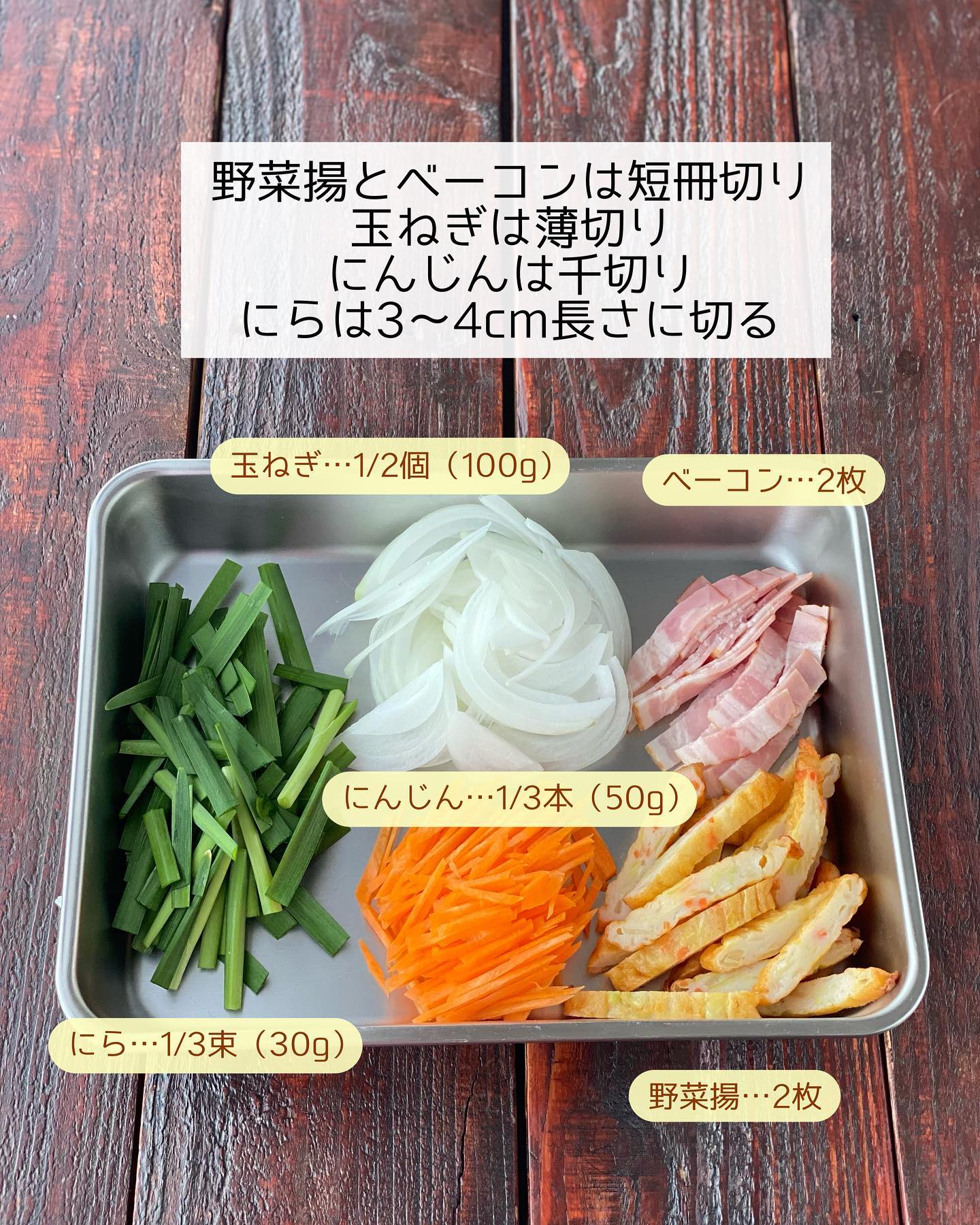 ➋野菜揚とベーコンは短冊切り、玉ねぎは薄切り、にんじんは千切り、にらは𝟹〜𝟺𝚌𝚖長さに切る。