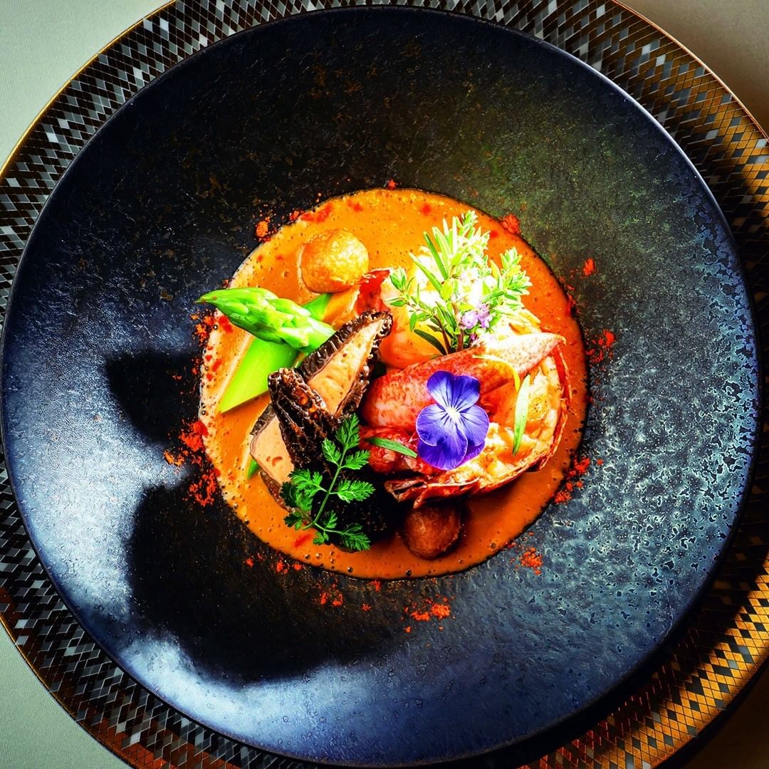 アスパラガスやモリーユ茸など春を感じさせる彩り豊かな盛りつけでサーブ。故ジョエル・ロブションさんが好んだというこの組み合わせは、渡辺雄一郎シェフにとっても思い入れが深く「春が来たと感じると