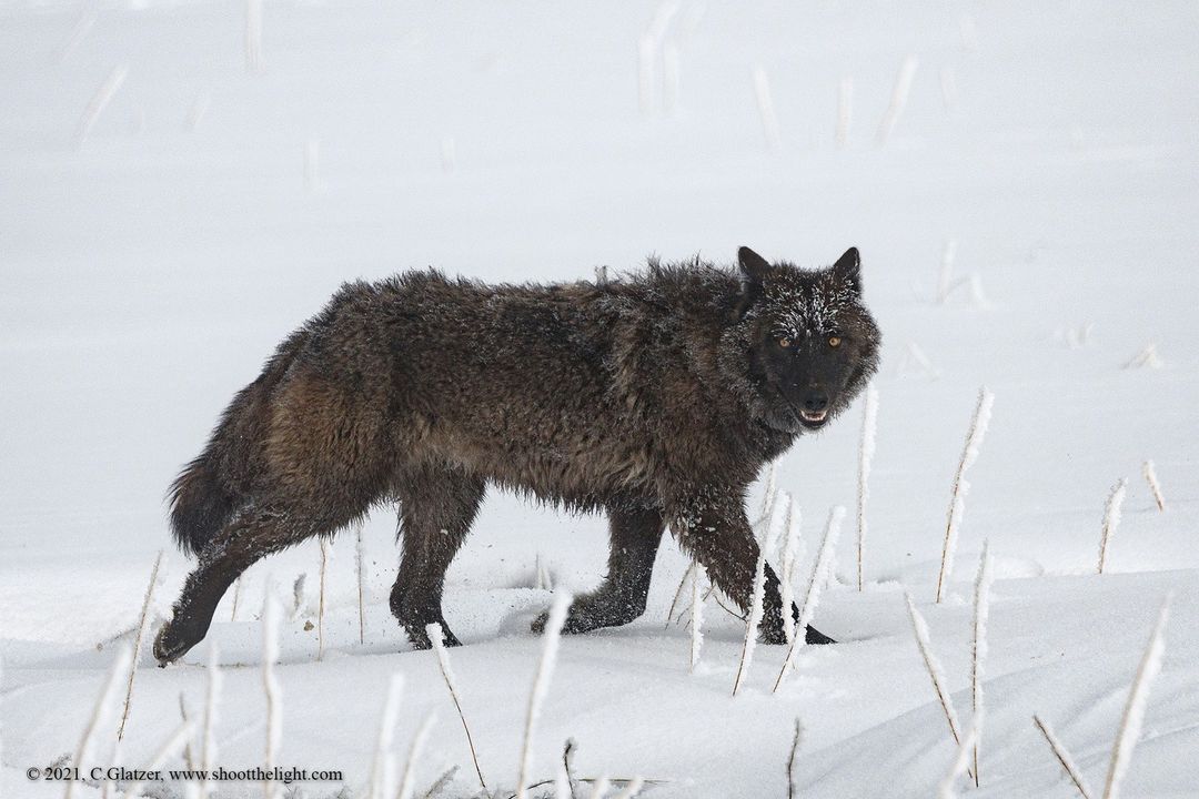 Wolves are an iconic keystone species and every wildlife photographer dreams of capturing wolves in their natural environment. I have spent almost two decades photographing winter wildlife in Yellowstone, and over that period of time I have seen many wolves, but getting great images, well that’s another story. Most often the wolves are viewed through a spotting scope miles away. I often get asked how long it took to get this image…truth be told 20 years or 1/2000 sec! 😉 ”