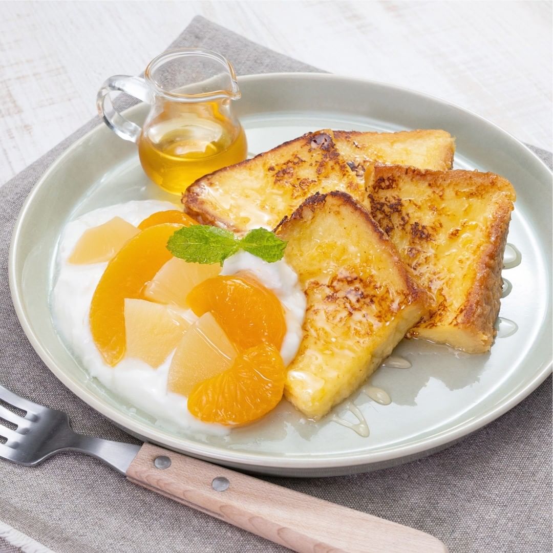 ヨーグルトと「朝からフルーツミックス(パウチ)」のシラップを使用することで、優しい甘みのさっぱりとしたフレンチトーストが完成❣️電子レンジで漬けこみいらずで簡単!