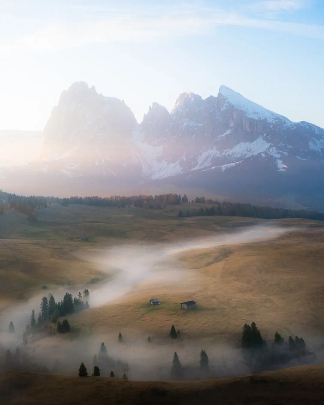 Those lil cabins basking in the morning sun at Alpe di Siusi 😍🏚️