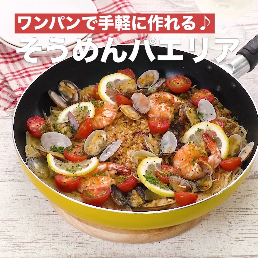 ①<ワンパンで手軽に作れる♪そうめんパエリア>