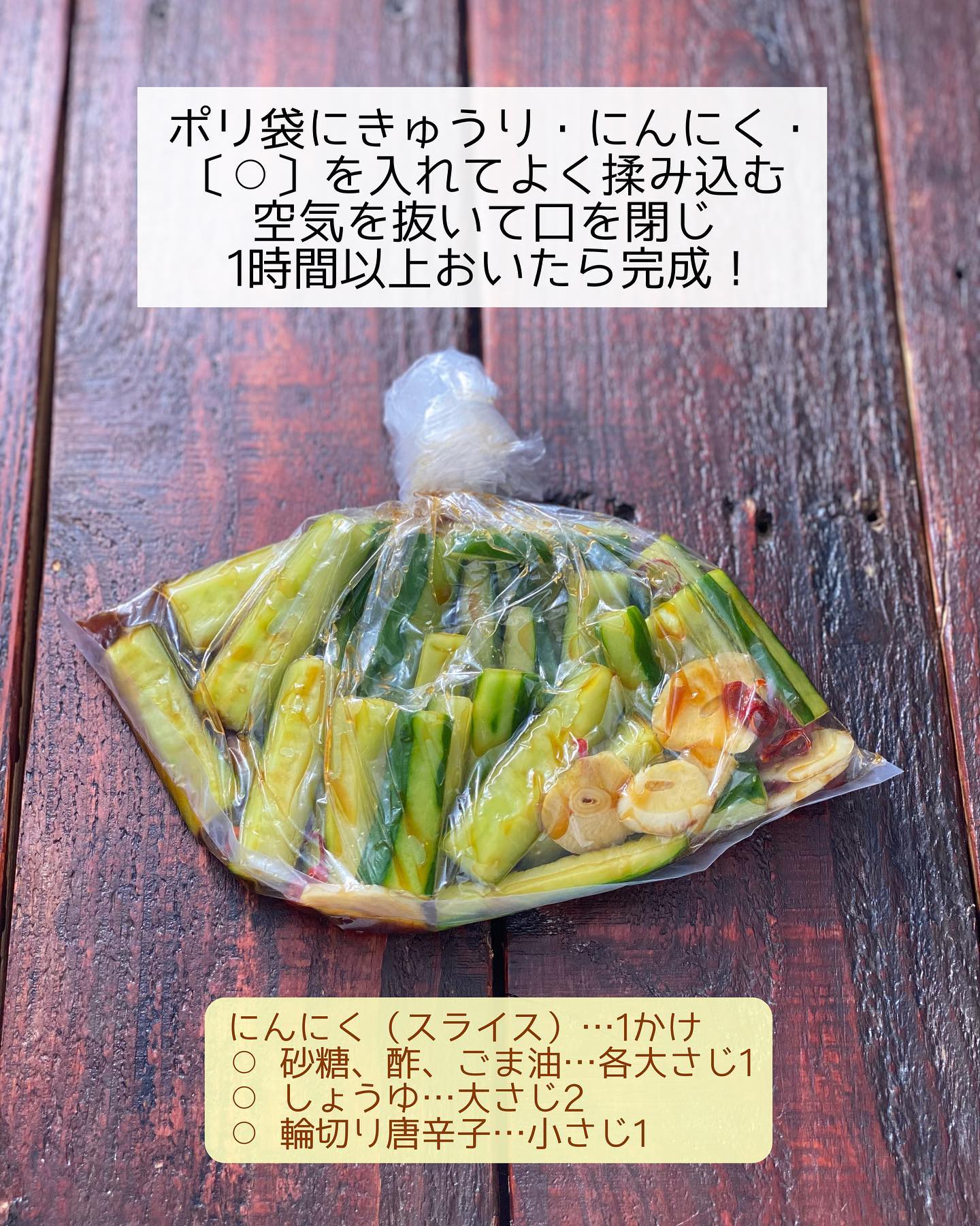 ➋ポリ袋に1・にんにく・〔⚪︎〕を入れてよく揉み込む。空気を抜いて口を閉じ、𝟷時間以上おいたら完成!