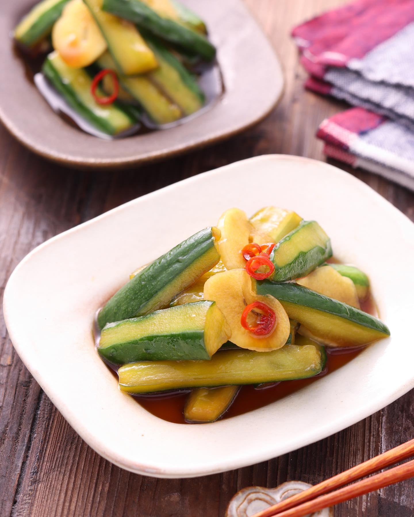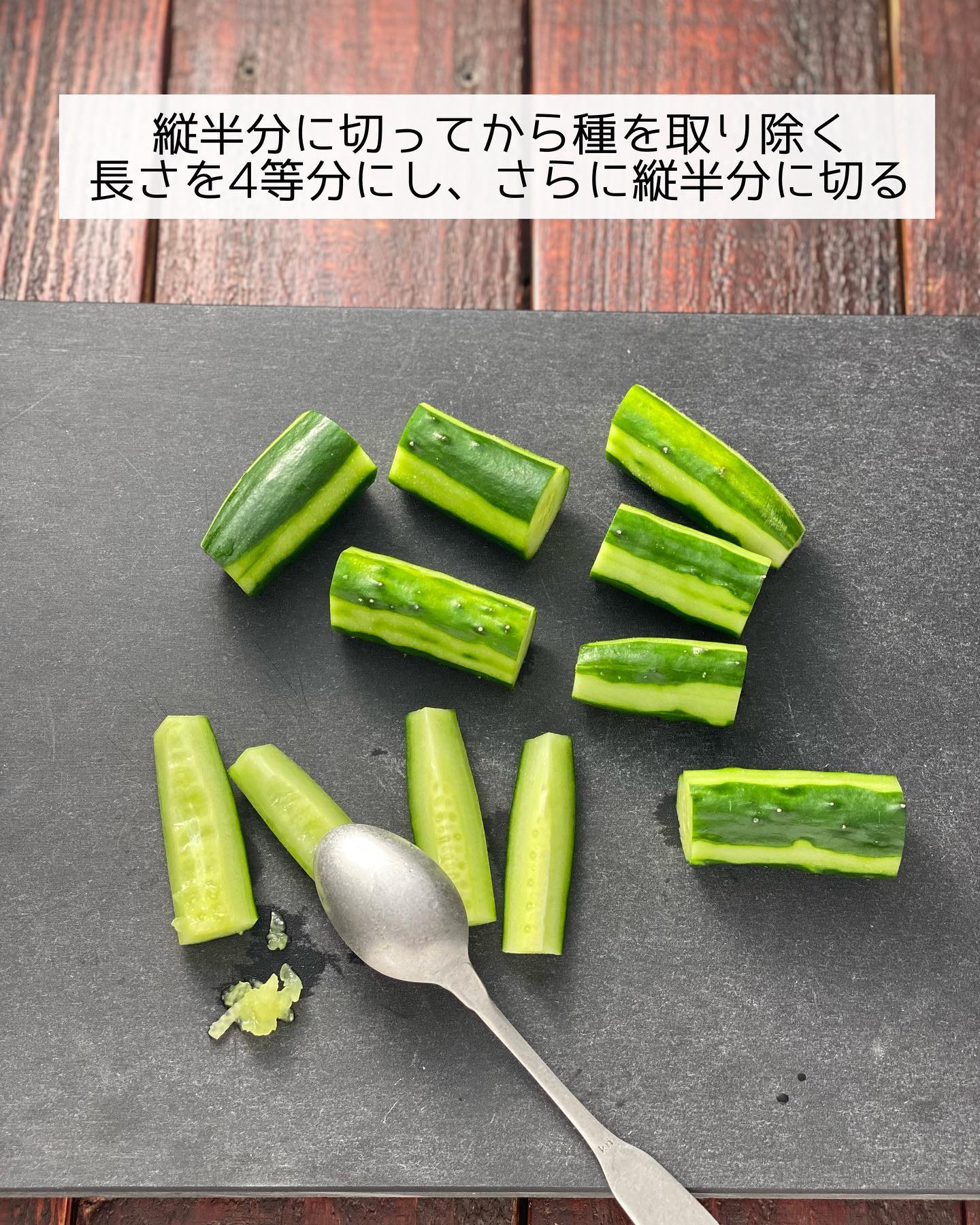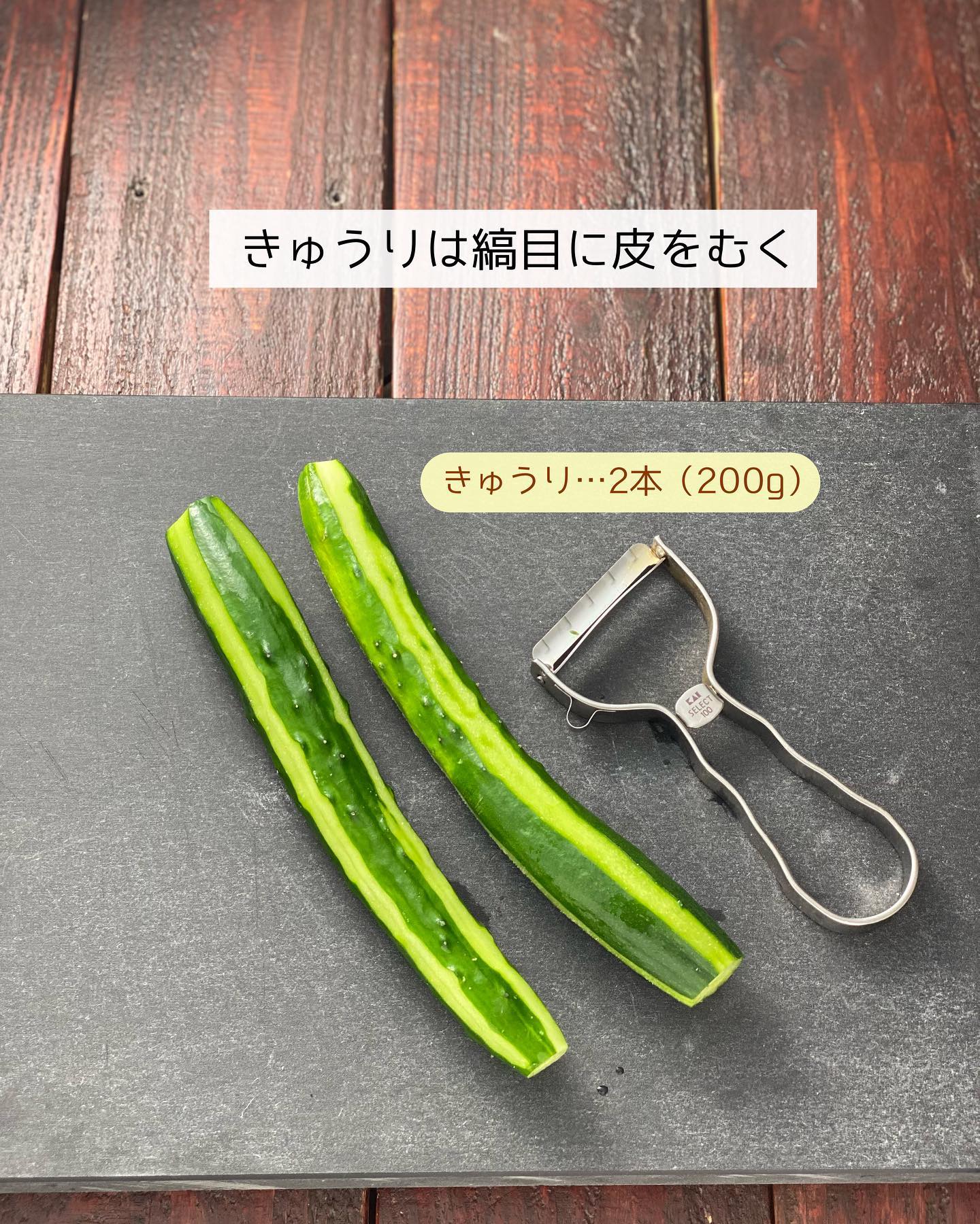 ➊きゅうりは縞目に皮をむき、縦半分に切ってから種を取り除く。長さを𝟺等分にし、さらに縦半分に切る。