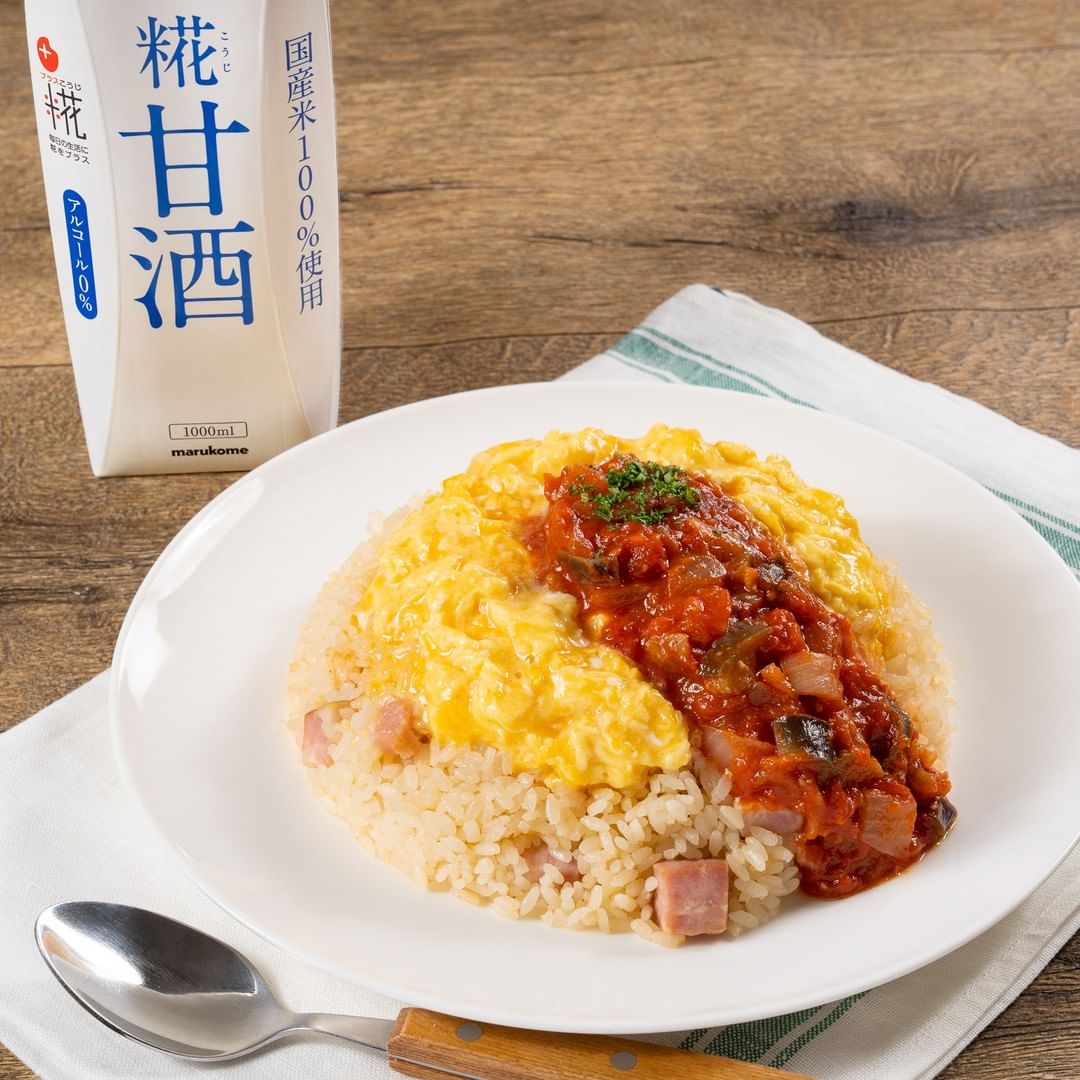 電子レンジと炊飯器で簡単!糀甘酒を使った夏野菜ふわとろオムライスのご紹介です。糀甘酒のやさしい甘みとコクがごはんやトマトソース、卵と相性抜群で、何度も食べたくなる味わいに仕上がります。火を使わずに調理できるので、夏の暑い日にもぴったりです!ぜひお試しくださいね。
