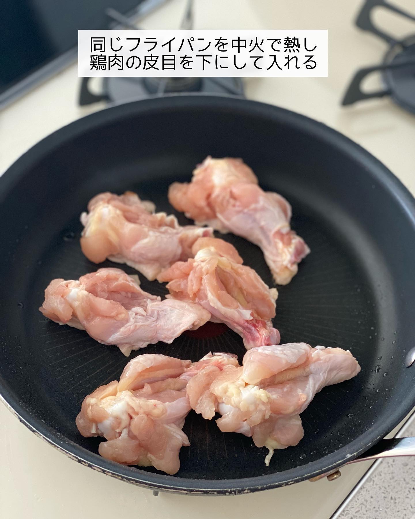 ➌同じフライパンを中火で熱し、鶏肉の皮目を下にして入れる。途中裏返して𝟸〜𝟹分焼き、焼き色がついたら〔⚪︎〕を注ぐ。ひと煮立ちしたら落とし蓋をし𝟷𝟶分ほど煮る(中火のまま)。