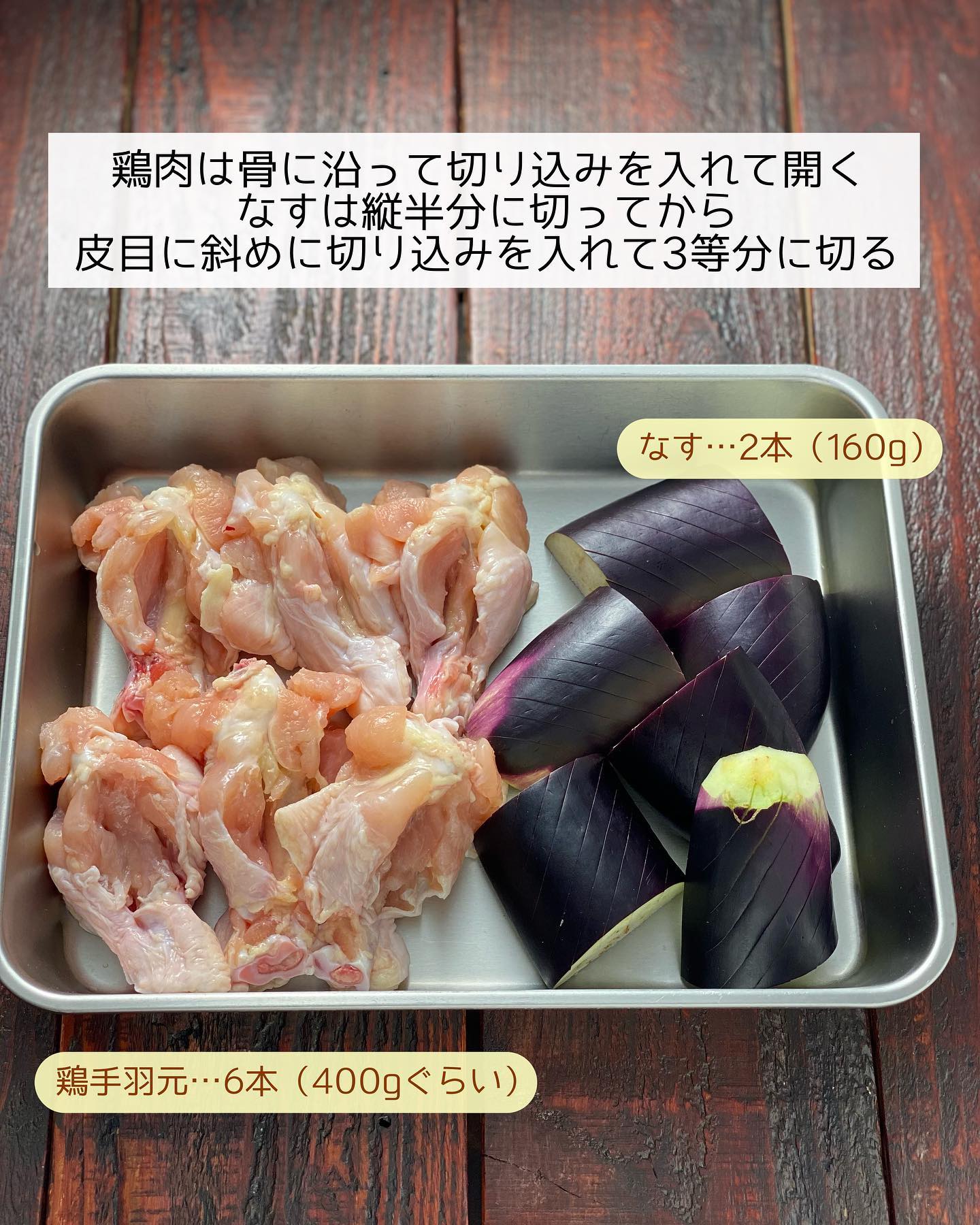 ➊鶏肉は骨に沿って切り込みを入れて開く。なすは縦半分に切ってから皮目に斜めに切り込みを入れて𝟹等分に切る。