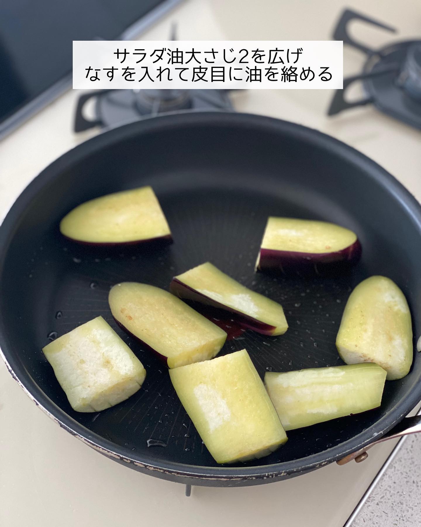 ➋フライパンにサラダ油を広げ、なすを入れて皮目に油を絡める。強火にかけて𝟸分ほど焼き、裏返してさらに𝟷分ほど焼く。焼き色がついたら一旦取り出す。